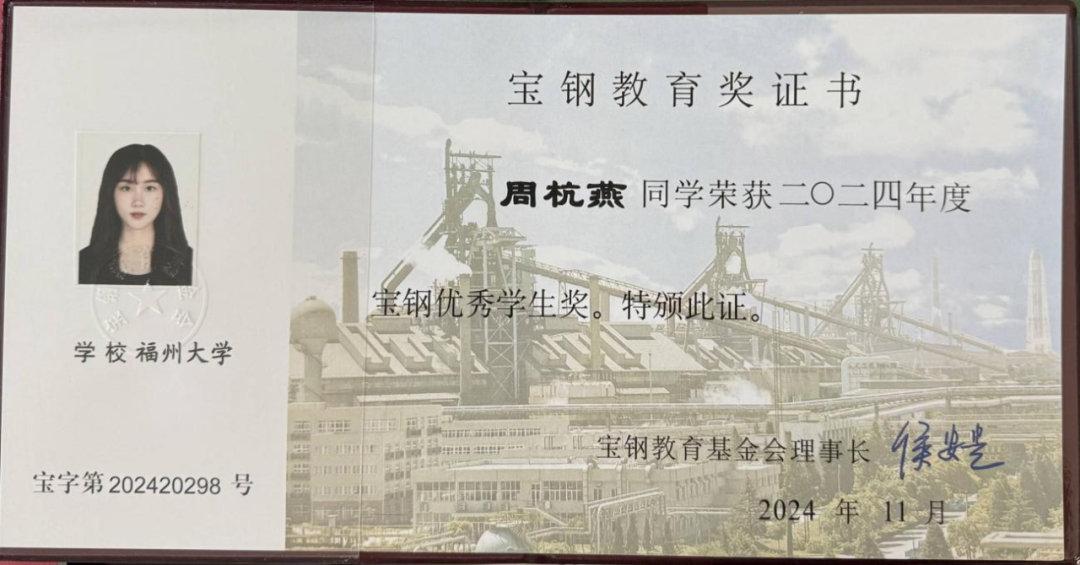 研究生学术科技月——“科华杯”企业命题大赛三等奖,2024年度宝钢优秀学生奖等荣誉。