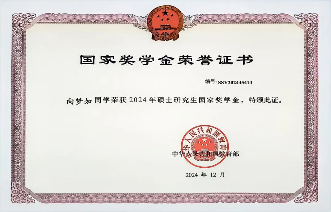 攻读硕士研究生以来,向梦如始终以“博学慎思、明辨笃行”为准则,在电气工程领域深耕不辍。面对繁重的课程与科研任务,她目标清晰、计划严谨,以专业排名前13.5%(19/141)的优异成绩,连续斩获硕士研究生新生奖学金、中期奖学金及国家奖学金。她注重理论联系实际,积极参与课堂研讨与课题研究,常与导师、同门深入探讨专业难点,以审慎的学术态度攻克学习难题,为科研实践打下坚实基础。