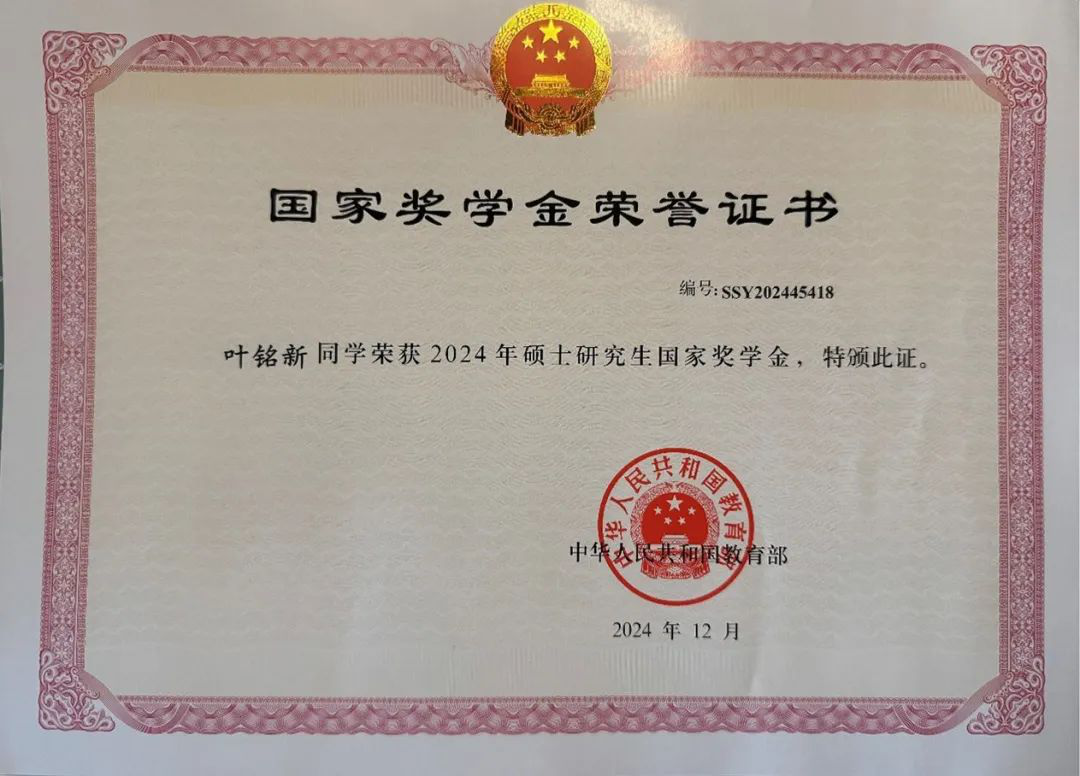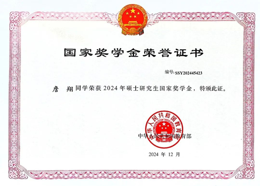 硕士研究生优秀新生一等奖学金、中期优秀学业二等奖学金等荣誉。同时,他积极参加科技比赛并获得“科华杯”三等奖、新中特成果展示大赛二等奖。他坚信只有坚持不懈、脚踏实地,才能在未来的道路上不断攀登新的高峰。