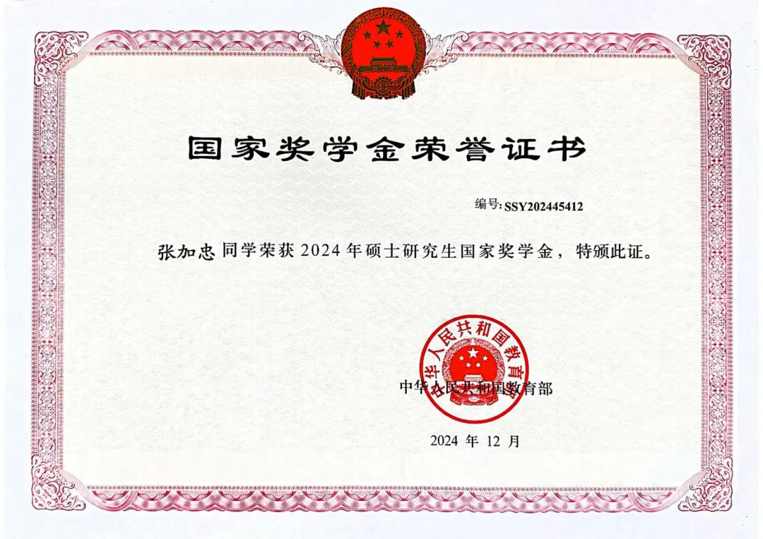 “勤学如春起之苗,不见其增,日有所长”。在研究生阶段,张加忠始终秉持勤奋刻苦、追求卓越的信念,以近乎严苛的标准要求自己,面对电气工程领域复杂的课程学习,他认真钻研、勤于思考,面对学习难题时不轻言放弃。这样的学习态度让他取得了优秀的学业成绩,获得了2024年硕士研究生国家奖学金、成人影视片