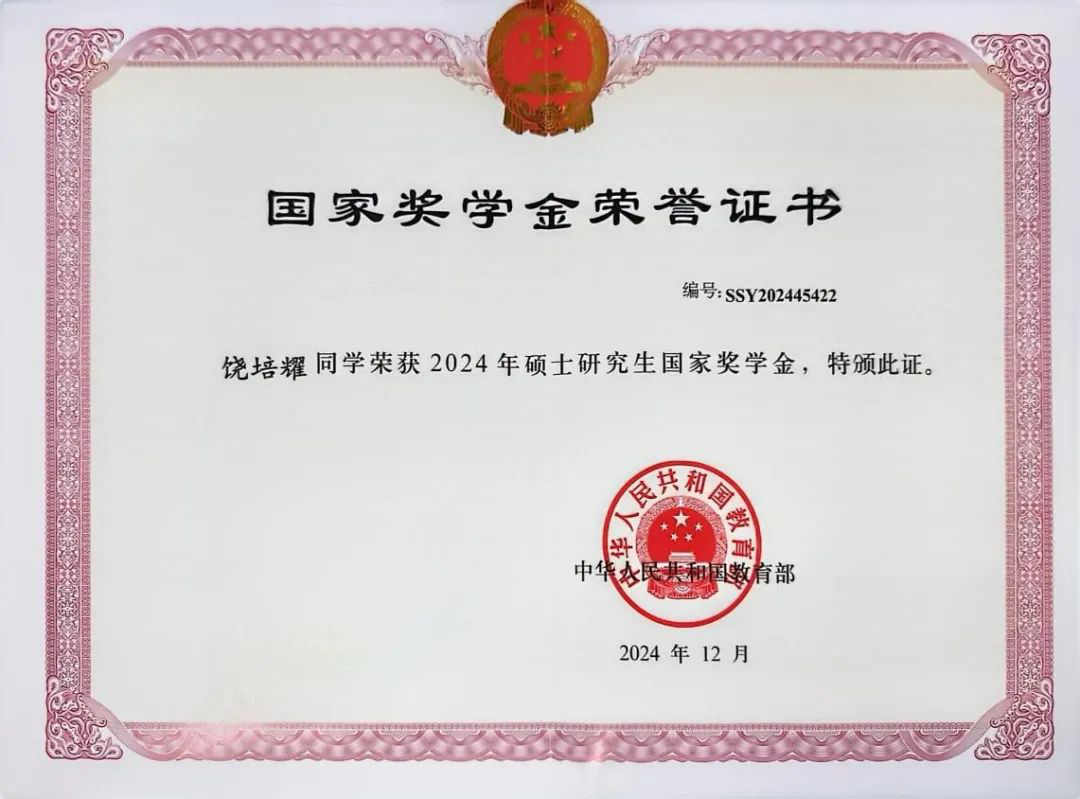 六年本硕求学的历程中,饶培耀以笃学不倦的治学态度谱写着青春华章。他始终以"追求卓越"为学术信条,面对日益精深的专业课程,他始终秉持精益求精的态度,在学术道路上锐意进取。无论是课堂还是课后,他都力求做到最好。本科阶段,他曾多次获得学业奖学金,并在2023年以优异成绩保研进入本校读研;在攻读硕士学位期间,他认真学习专业知识,重视基础课程的学习,专业知识牢固,学习成绩优秀。