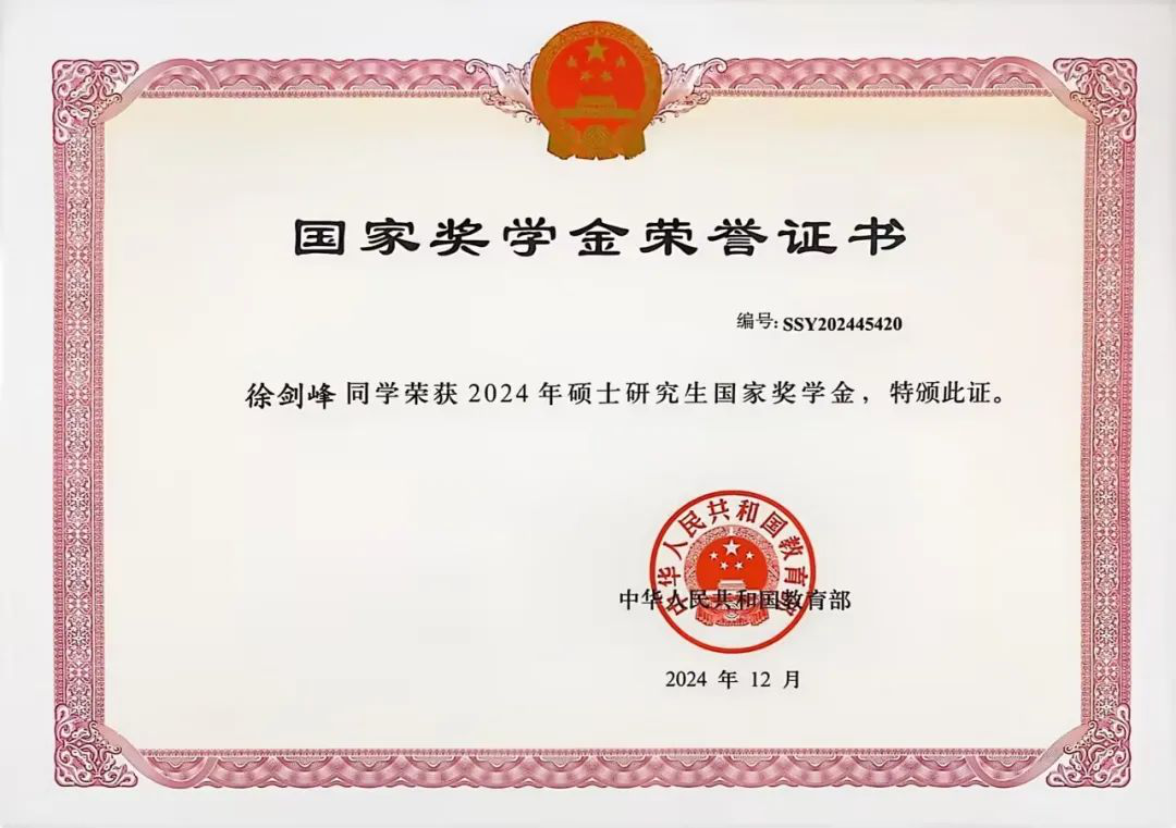硕士研究生中期优秀学业二等奖学金。在导师郑泽胤的悉心指导下,他快速掌握了科学研究的基本方法,并在此基础上深入探索和创新,科研工作稳步推进,徐剑峰以导师一作,本人二作身份发表了SCI二区论文一篇,录用SCI一区论文一篇。他坚信,只有坚持不懈、脚踏实地,才能在未来的道路上不断攀登新的高峰。