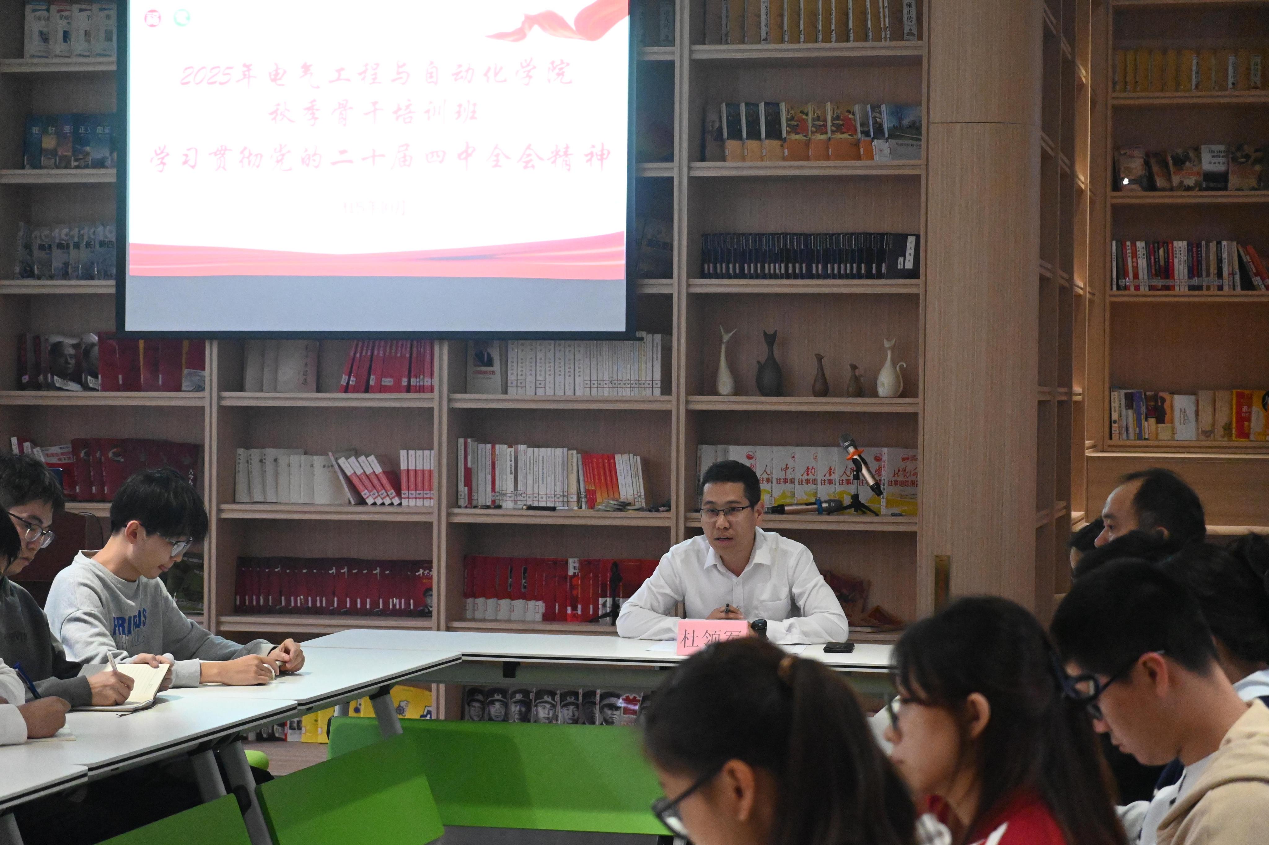 学习交流会上,杜书记首先带领全体学子深入学习二十届四中全会精神,并提出三点明确要求:一是坚持深学筑基,原原本本研读全会公报与《中共中央关于制定国民经济和社会发展第十五个五年规划的建议》原文,深刻领会“科技自立自强”“新型能源体系”等部署的战略内涵,在学思践悟中筑牢思想根基;二是注重细读破题,结合电气学科特色精准把握核心要义,厘清学科发展与“双碳”目标、能源安全等国家战略的内在关联;三是强化执行见效,将学习成果转化为具体行动,把理论认知落实到专业学习与科研实践中,确保全会精神落地生根。