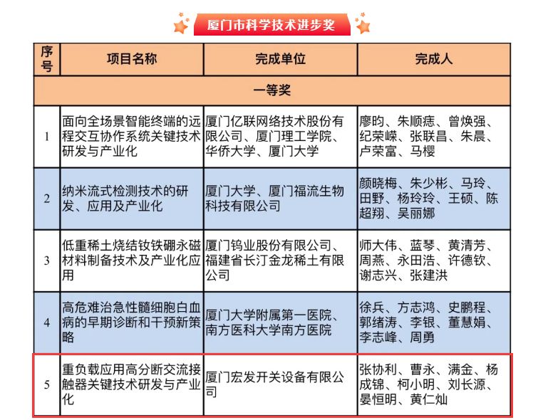 日前,2019年度厦门市科学技术奖揭晓,宏发开关设备有限公司报送的《重负载应用高分断交流接触器关键技术研发与产业化》项目荣获“厦门市科技进步一等奖”。此次,获奖项目《重负载应用高分断交流接触器关键技术研发与产业化》由张协利担任第一完成人,其余7名项目成员中,杨成锦、柯小明、刘长源、黄仁灿4人均为福大电气校友。