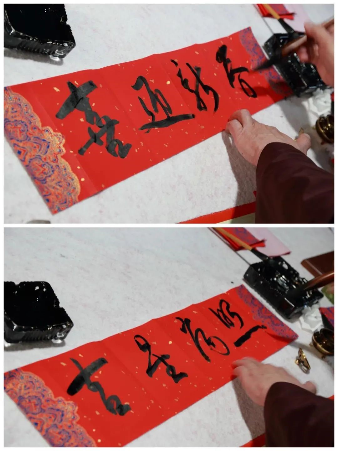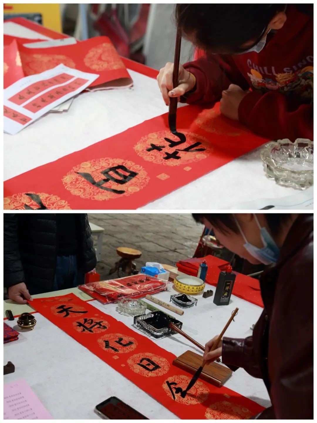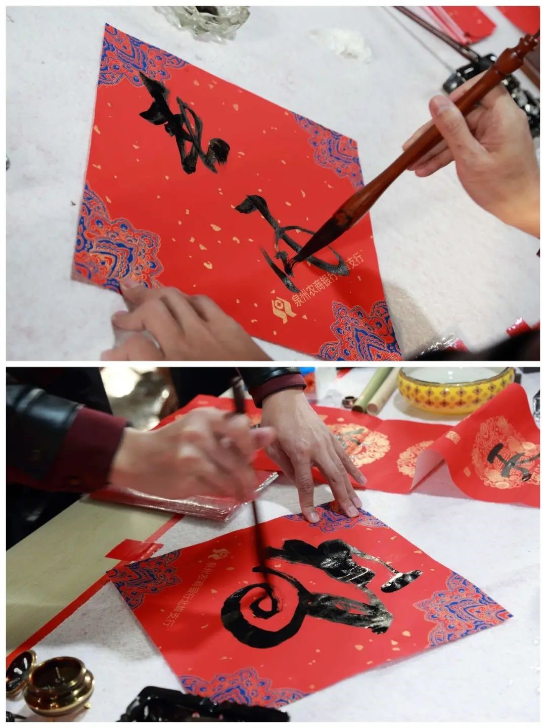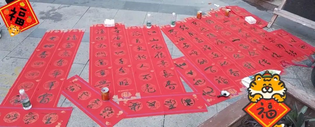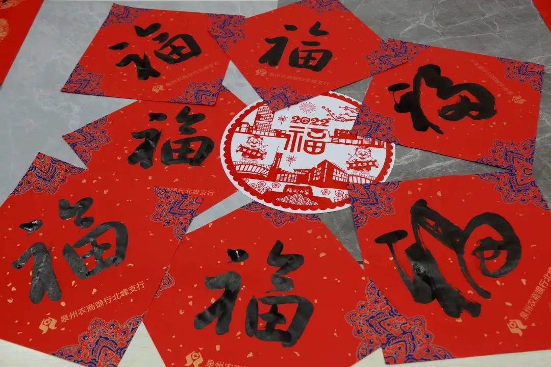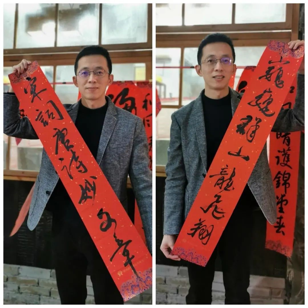 ”为题,在各校友群里开展了好联佳句征集活动。校友们踊跃参与,精彩联句层出不穷。活动开始之后,部分擅长书法的校友及校友家属到场为校友义务书写赠送春联。既有小朋友们工工整整的“爆竹冲天去报喜,飞花入门来贺年”,又有豆蔻年华的年轻人写下的“万里春华开锦绣,九州龙虎会风云”、“瑞日芝兰光甲弟,春风棠棣振家声”,更有校友们自创的“福天福地福人间,大国大家大中华”、“福光普照大家乐,泉水均滋校友欢”、“明德至诚有福之州,博学远志满街圣人”……执笔者或一笔一划、颜筋柳骨,或风华正茂、矫或惊龙,或行云流水、铁书银钩,浓浓的春意在笔尖绽放,深深的祝福在纸上流淌。草书、行书、隶书、魏碑、行楷,泼墨造物、妙笔生花,一个个“福”字、一幅幅春联源源不断地被悬挂起来。观者一边读着联句细细品味,一边对精妙的书法赞不绝口,纷纷掏出手机拍摄作品或与作品合影留念。
