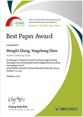 新能源发电与电能变换重点实验室周扬忠教授指导的硕士研究生郑梦飞论文荣获大会“最佳论文奖(Best Paper Award)”。