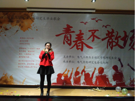 晚会伊始,由主持人代表主办方向大家问好,对同学们的帮助和支持表示感谢。接着,晚会节目正式开演。首先是郑伊伶和张琦同学带来的一首歌曲《小幸运》,希望能带给大家好运。紧接着,主席苑新博带来的歌曲《风吹麦浪》和王燕彬同学带来的歌曲《我的中国心》把大家带入了一个高潮。接下来同学们还欣赏了《七里香》、《年轮》、《残酷月光》、《时间煮酒》、《溺水三千》与《失落沙洲》等歌曲,歌曲伴着优美的旋律为大家带来美的享受。此外,现场还有“你来比划我来猜”和“双人夹气球”游戏环节,激起同学们的参与互动热情。晚会接近尾声的时候由研一同学演唱最后一首歌《送别》,道出了心中的不舍与美好祝愿。整场晚会表演十分精彩,台下反应强烈。