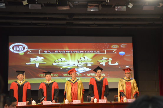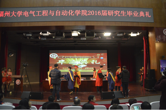 二〇一六届优秀毕业研究生(春季)表彰决定”。随后优秀毕业研究生上台领奖并且由优秀毕业研究生代表黄云程发言。紧接着教师代表、电力系主任郭谋发副教授发言。接下来院长陈为教授在毕业典礼上讲话。一是对研究生顺利完成学业表示祝贺,二是对毕业生提出几点期望:“希望同学们心底永远有一块纯洁的圣地,不要放弃科学和求实的精神,不要放弃崇高和远大的理想,不要放弃奉献和友爱的价值;同学们虽然毕业了,但并不意味着学习的结束;在一个思想和利益多元化、充满变革与挑战的的社会里,希望同学们能好好把握发展机遇、敢于挑战。”最后,毕业们依次走上主席台,院长陈为教授和副院长缪希仁教授为毕业生执拨穗礼,书记何希耕研究员和副院长薛毓强教授颁发毕业证书。活动在全体毕业生大合唱《毕业歌》的歌声中圆满结束。