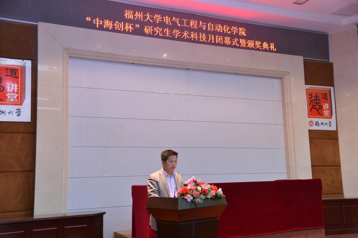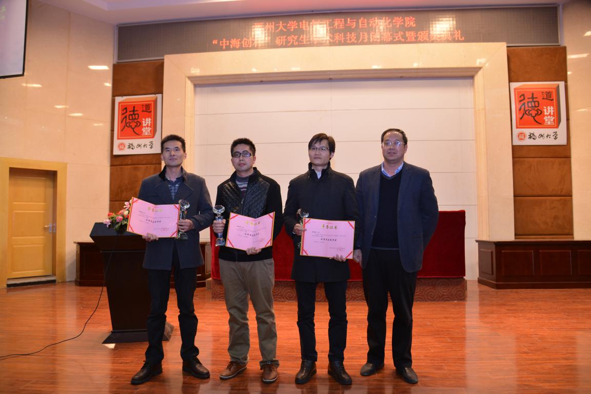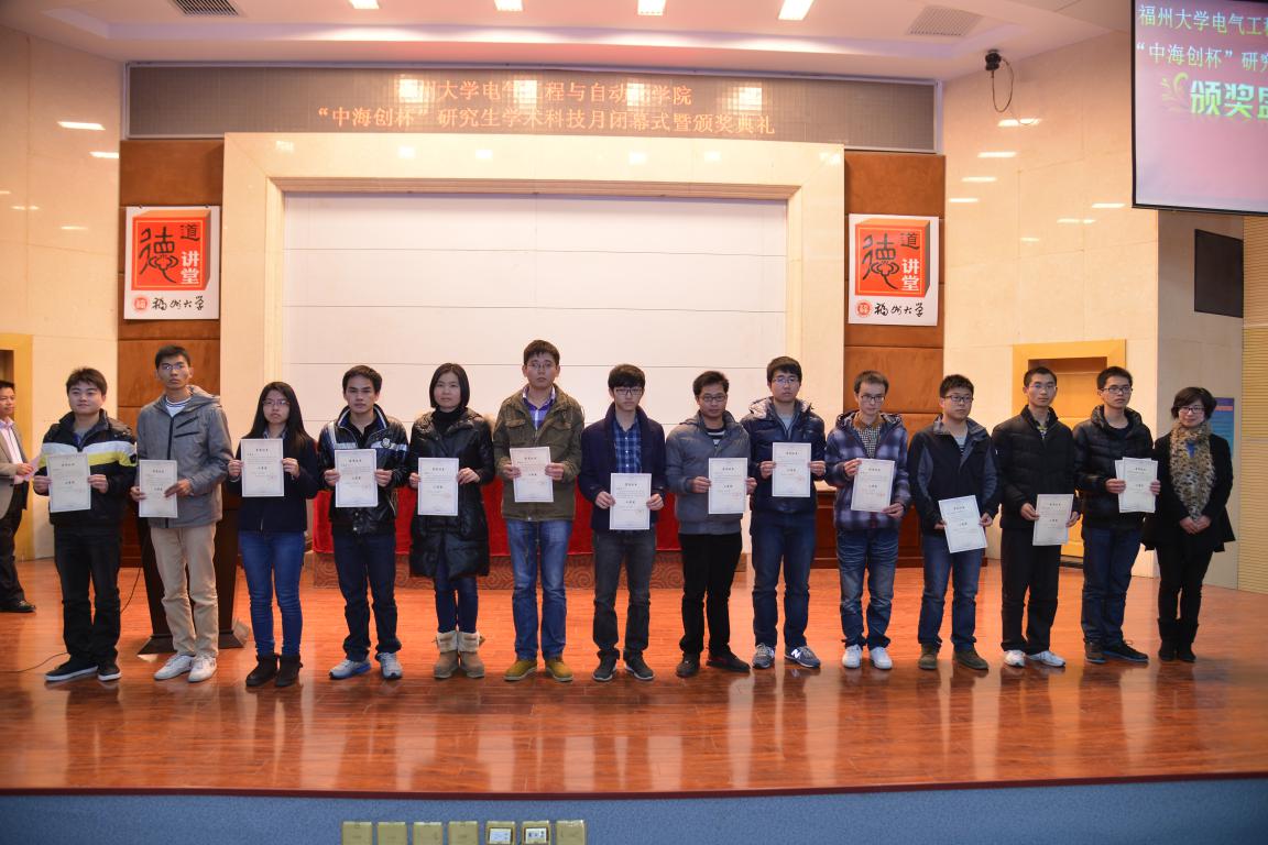 2014年“中海创杯”研究生学术科技月获奖作品和先进个人的表彰决定》。紧接着,领导为科技月先进个人和获奖作品颁奖,获得科技月“优秀指导老师奖”的6名老师和“特别贡献奖”的2名老师也上台领奖。最后,陈为院长为闭幕式致词,他对今年学术科技月进行了总结,肯定了学院研究生科技月的意义和成绩,并对学院今后研究生的创新创业教育提出几点要求。