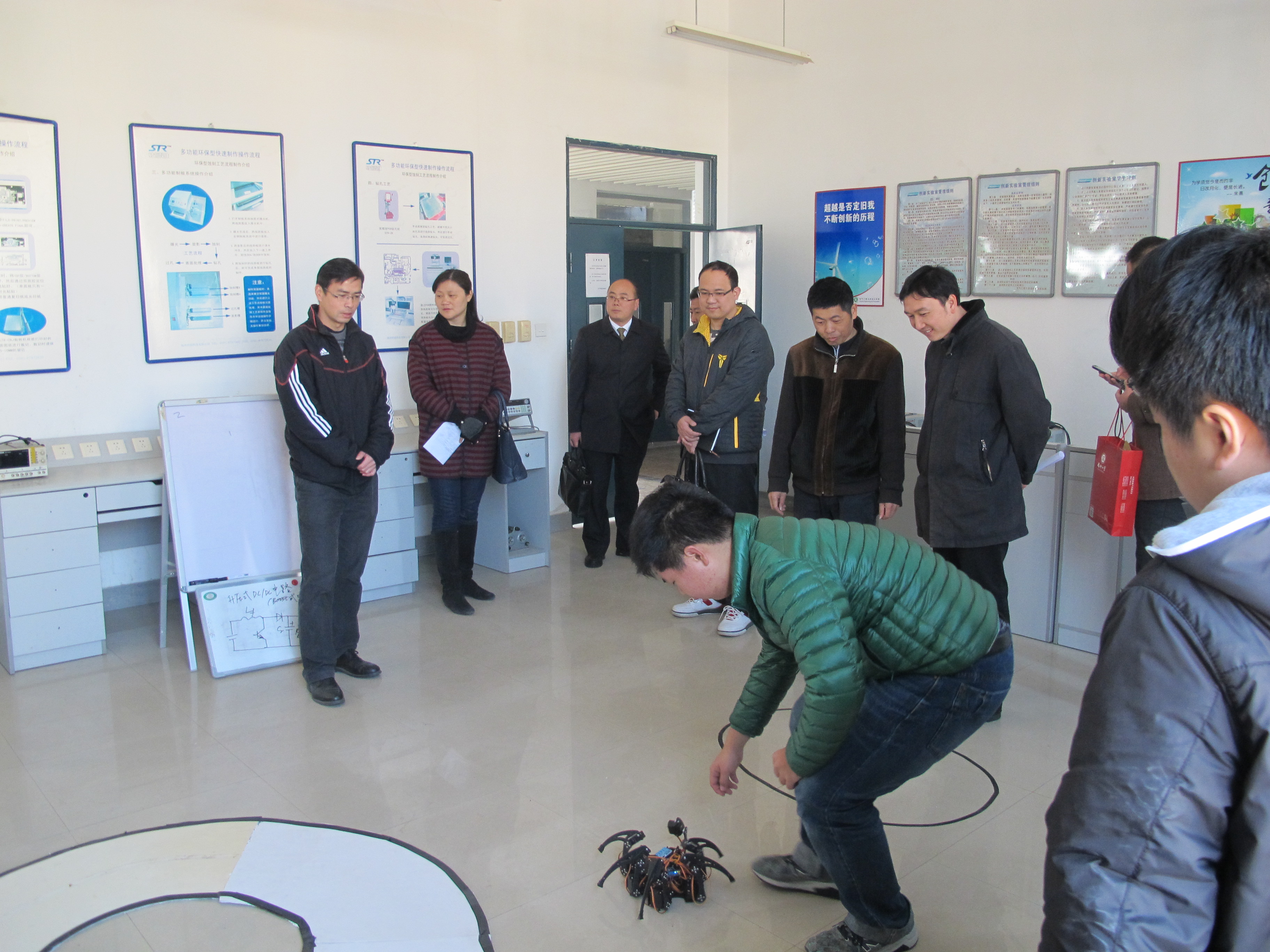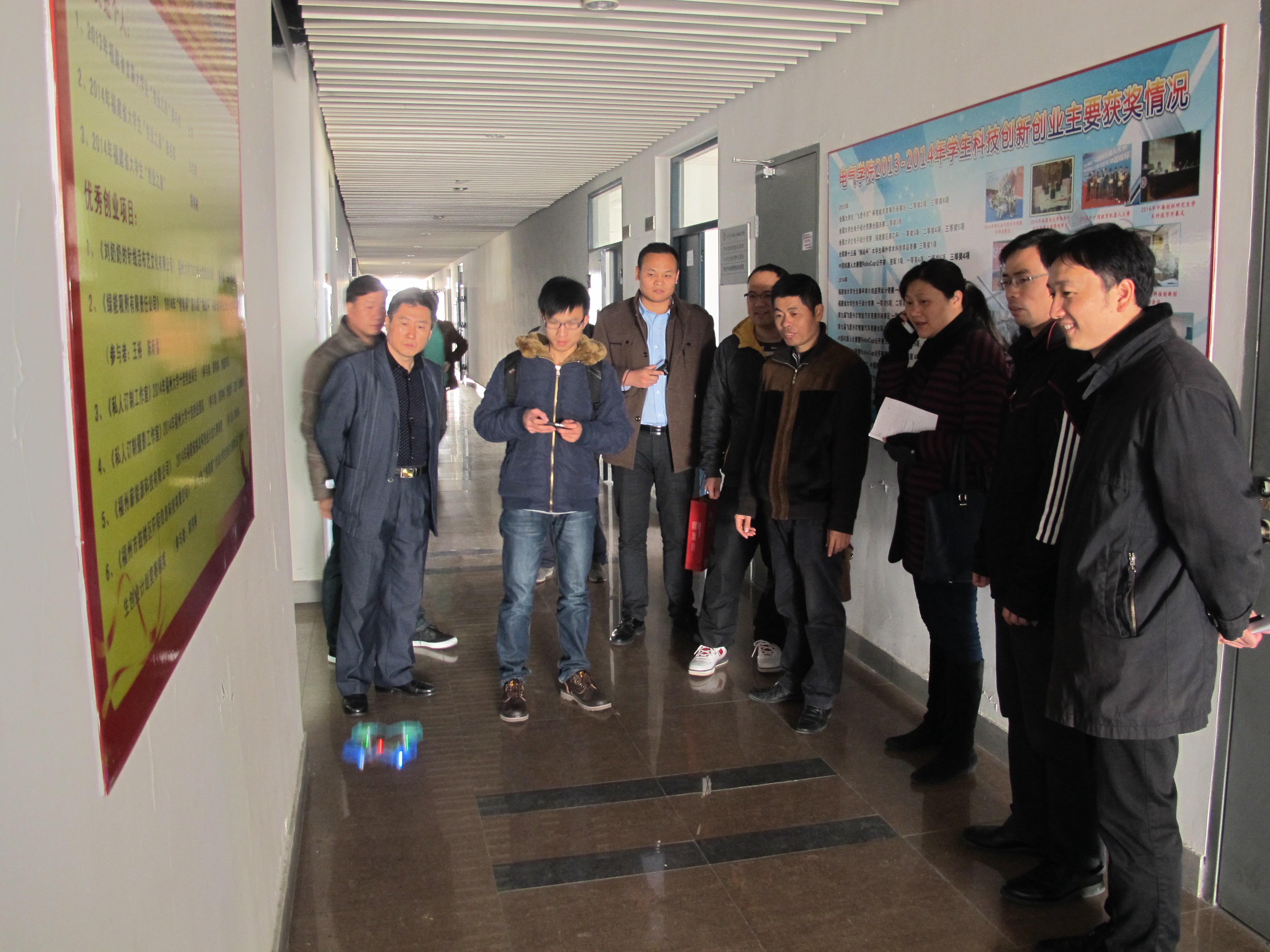 张志雄老师首先向领导小组简要介绍了学院近两年在科技创新创业方面所取得的主要成绩。在学院南405,学院科技创新的同学向领导小组现场展示了智能车、机器人以及手机遥控的飞行器,引起了领导小组的极大兴趣,同学们也简要回答了老师提出的问题,得到了评估小组的好评。