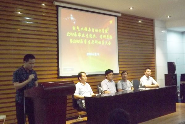 在主持人尹万东老师对会议内容进行了简短的介绍后,潘志辉书记发表了关于表彰2014届先进班级和先进个人的决定。接着,尹万东老师分别宣布了2014届就业先进班级、就业达标班级和考研先进班级及考研先进个人的获奖名单。