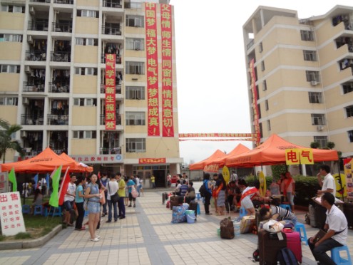 生活区迎新点。学院团委学生会和2012级的同学们一大清早已投入紧锣密鼓的准备工作中。