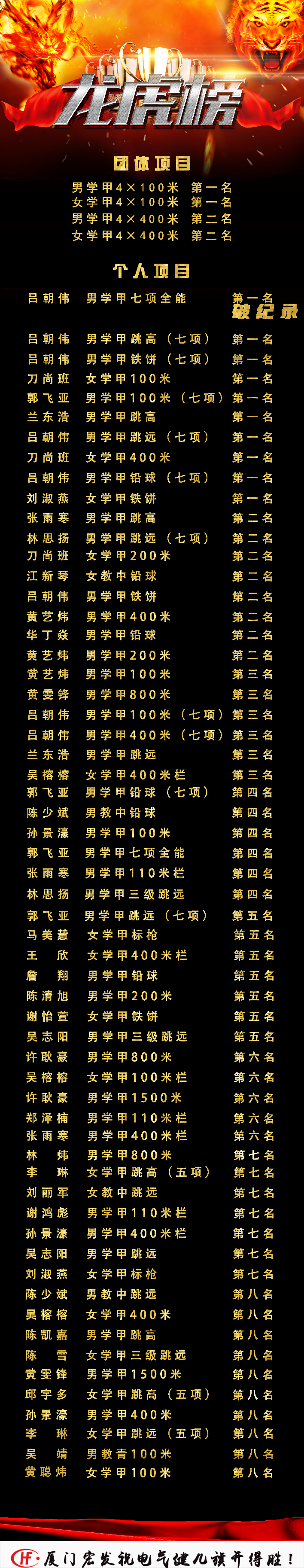 战功赫赫,继第49届勇夺桂冠后,于本届(第50届)蝉联冠军,获得团体总分第一、男学甲第一、女学甲第四、群体振奋杯第一及体育道德风尚奖的好成绩!同时再次感谢厦门宏发电声股份有限公司对成人影视片