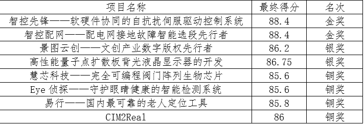“智控先锋”项目优化了软硬件协同的自抗干扰伺服驱动控制系统,为中国智能制造转型提供技术支持;“智控配网”项目用时四年,历经多次迭代升级,成功攻克配电网接地故障智能选段难题;“景图云创”项目为文化产业繁荣稳定发展提供新思路,创新性地研发出区块链版权服务平台,有力保护了文创产业数字版权并提高了数字化生产效率;“高性能量子点扩散板背光液晶显示器的开发”团队创新性地改进了量子点与扩散板有效结合技术,使其具备环保高效、成本低廉、光学性能良好等优点;“慧芯科技”项目在生物科技芯片取得重大突破,解决了传统芯片多功能领域运用难的问题;“Eye侦探”团队研发了眼睛智能检测系统,为国民用眼健康保驾护航;“易行”团队研发了新型老人适宜定位工具,为老人生命安全护航;“CIM2Real”团队聚焦数字城市改革中的各种问题,用时两年,建立了增速增效、兼容性强、数据可视化的大数据库,为城市未来专业化发展有效预测提出了良好方案。