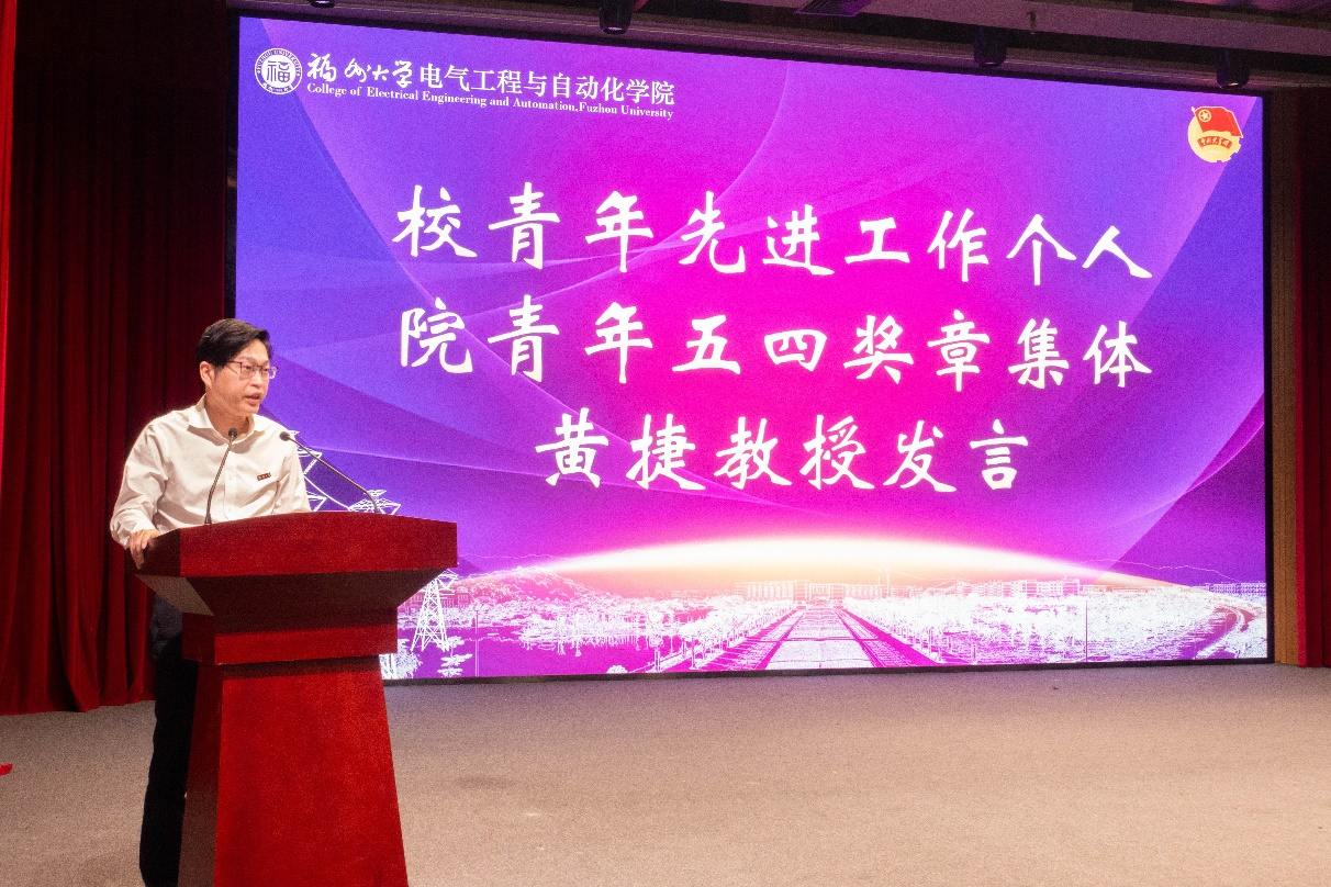 第七项议程 ,校青年先进工作个人、院青年五四奖章集体代表黄捷教授发言。黄捷教授首先回顾了五四运动的光辉历程,并表明了当代青年所肩负的历史使命。他强调,新时代青年应培养艰苦奋斗的精神,将个人理想与国家的前途命运紧密相连。黄捷教授呼吁青年教师要以敢为人先的担当精神,努力创业奉献,积极投身到学院事业发展中去。同时,他也号召青年学子们以实干兴邦、拼搏奉献为信条,接过先辈的接力棒,为实现祖国强盛和个人价值而努力奋斗!