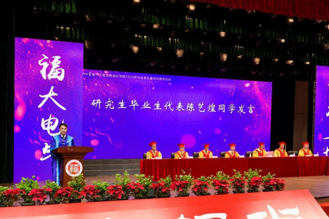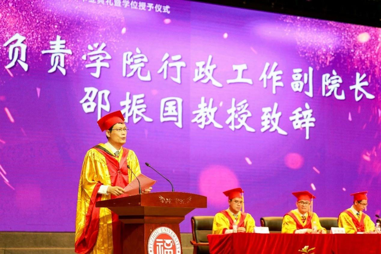 学院负责学院行政工作副院长邵振国教授发表讲话,向毕业生们表示最热烈的祝贺!他回顾同学们在学术道路上的成长与蜕变,嘱咐毕业生们始终保持学术精神与品格,使之成为走向社会、成就卓越的精神内核。与同学们分享三位福大电气人的故事,他期望毕业生们能够秉承电气人的光荣传统,不负时代、不负华年,让青春在创新创造、奉献平凡和不懈奋斗中熠熠闪光。