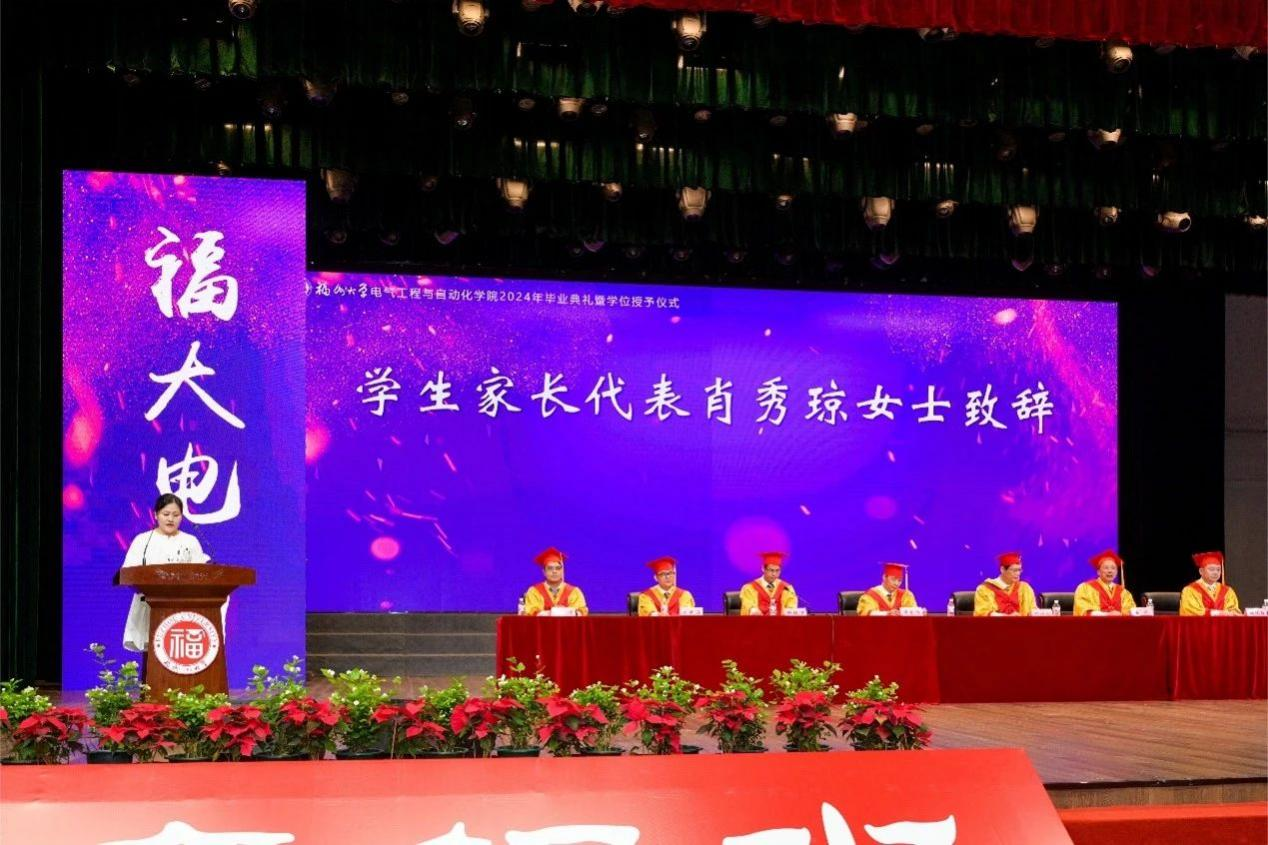 学生家长代表肖秀琼致辞,她对毕业生们表示了热烈的祝贺,并提出三条人生感悟:常怀感恩之心,厚植家国情怀;坚守责任之心,勇担时代重任;保持奋斗之姿,领跑人生赛道,希望以此与所有电气学子共勉成长。