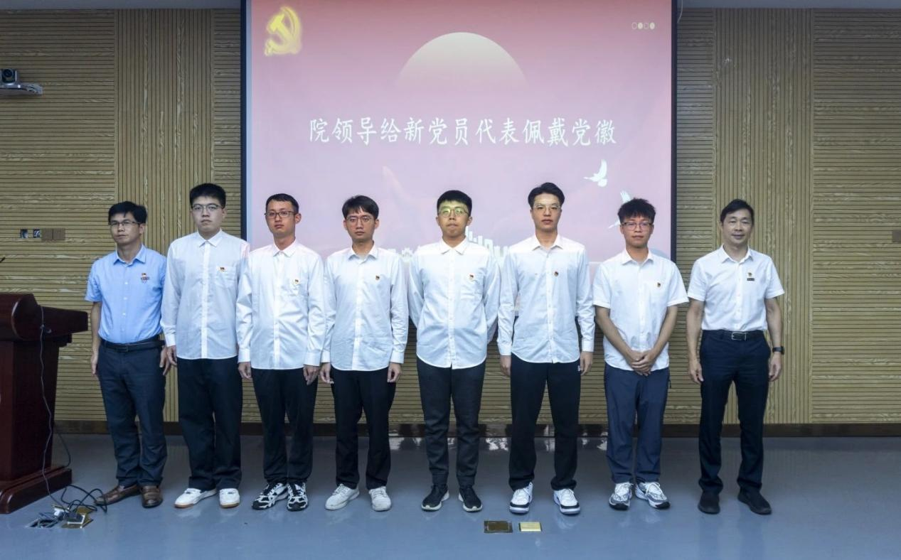 潘志辉书记和钟钛申副书记为六位新党员代表庄重地佩戴上党徽。这不仅标志着他们党员身份的正式确认,更是对承担党性责任的深刻提示。党徽的佩戴,是对新党员们不忘初心、牢记使命的激励,象征他们将党的宗旨铭记于心,并努力践行党员标准,成为优秀党员的典范。