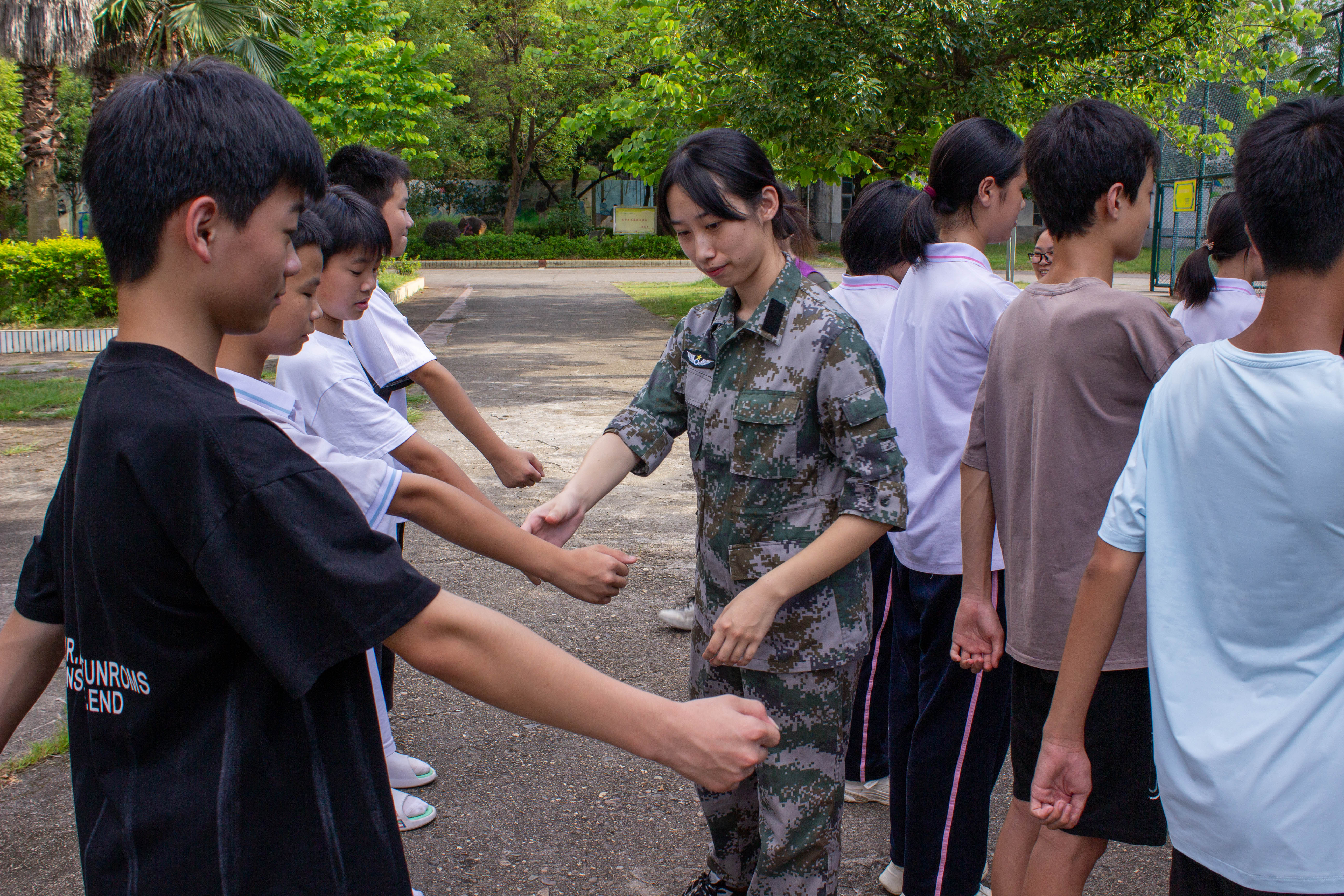 在本次活动中担任教练员的实践队队员童淅瑶是一名大学生退伍军人。童淅瑶同学为当地少数民族学生们展示中国军人的风采,分享自己两年军旅生涯的故事与参军入伍的感悟,并对军事训练体验的内容进行简要介绍。同学们听得入神,眼中充满着期待。介绍结束后,童淅瑶组织训练有序开始。站军姿、齐步走、正步走、跨立……各项动作训练有条不紊,循序渐进。童淅瑶一遍遍向学员们示范标准动作,讲解动作要领。参训的畲族小伙伴们也一点儿都不马虎,严肃认真,令行禁止;在教练员的耐心指导下姿势动作越来越标准,整齐划一,利落有力,出色地完成所有动作训练,稚嫩的脸庞上眼神坚毅,显露出顶天立地的精气神来。