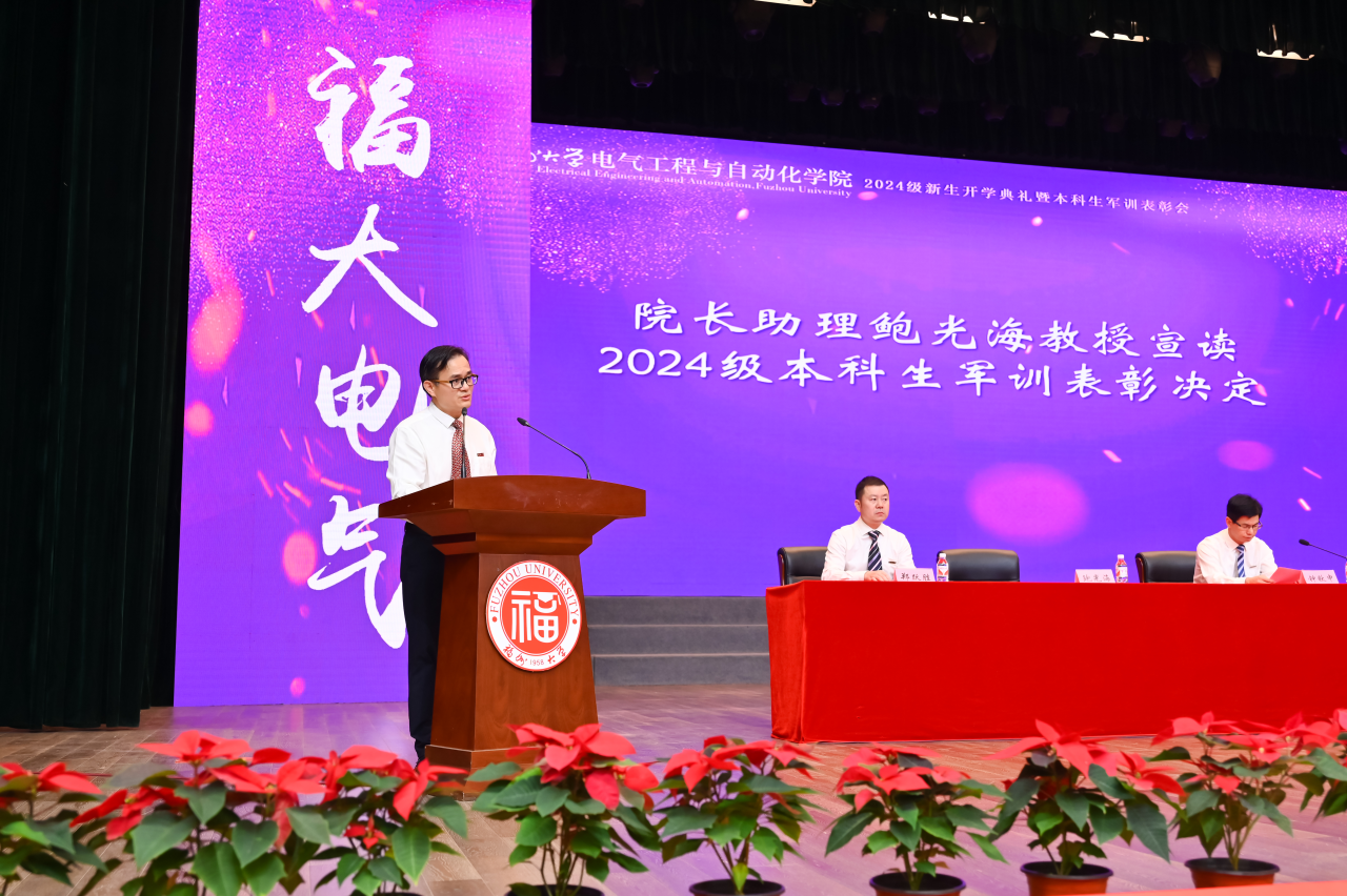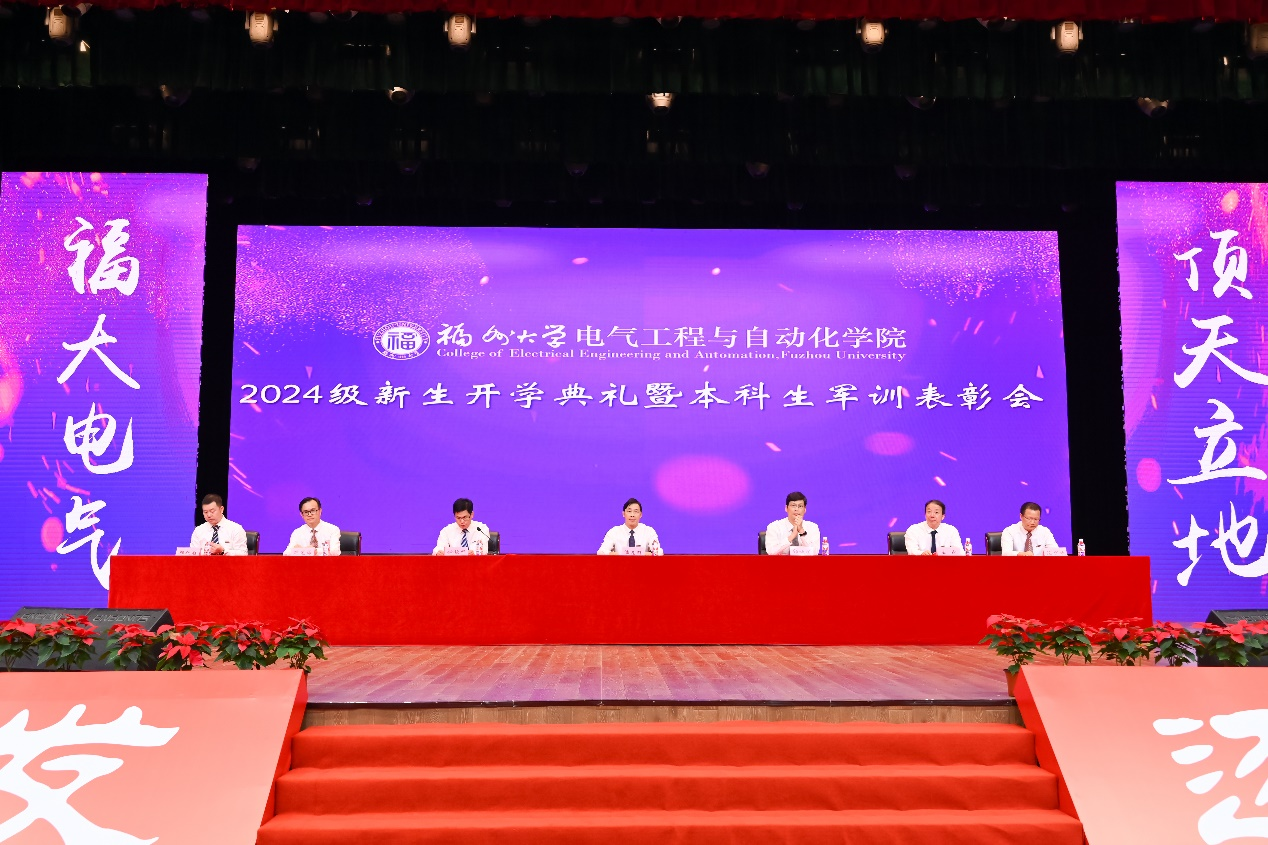 2024级新生开学典礼暨本科生军训表彰会在宏晖文体综合馆隆重举行。出席本次典礼的领导嘉宾有院党委潘志辉书记,负责学院行政工作副院长邵振国教授,院党委钟钛申副书记,副院长王武教授,院长助理鲍光海教授、郑跃胜教授,院党委委员、工会主席、自动化系党支部书记陈少斌副教授,出席典礼的还有各系主任、系支部书记、教师代表、引进生兼职辅导员、新生班主任、各年级辅导员以及全体2024级新生。典礼由院党委副书记钟钛申主持。