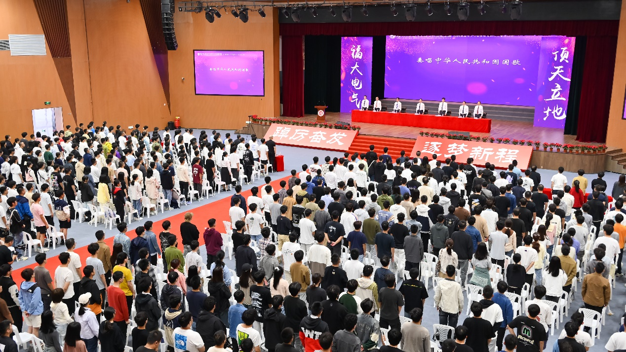 奏唱国歌,激发爱国情怀,嘹亮的国歌声在礼堂中回荡,开学典礼缓缓拉开帷幕。全体师生肃然而立,齐声高唱,洋洋盈耳,满怀荣耀与梦想,新的人生篇章即将开始书写。