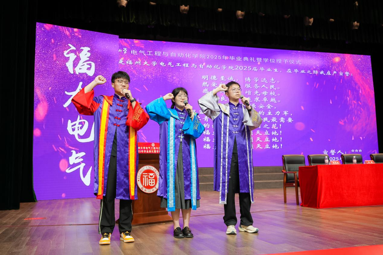 “指尖轻抚学位服上的院徽,仿佛与福大电气人的精神血脉产生了共鸣。这袭学位服,不仅象征着电气人的专属荣光,更是责任与希望的传承信物,凝聚着代代校友薪火相传的电气精神。临别之际,愿我们永葆福大人“榕树般”的韧劲,在风浪中扎深创新之根;铭记“明德至诚,博学远志”的校训,在科技强国的赛道上跑出福大人的加速度。此去星辰大海,愿我们乘风破浪,不负韶华,不负母校厚望!”
