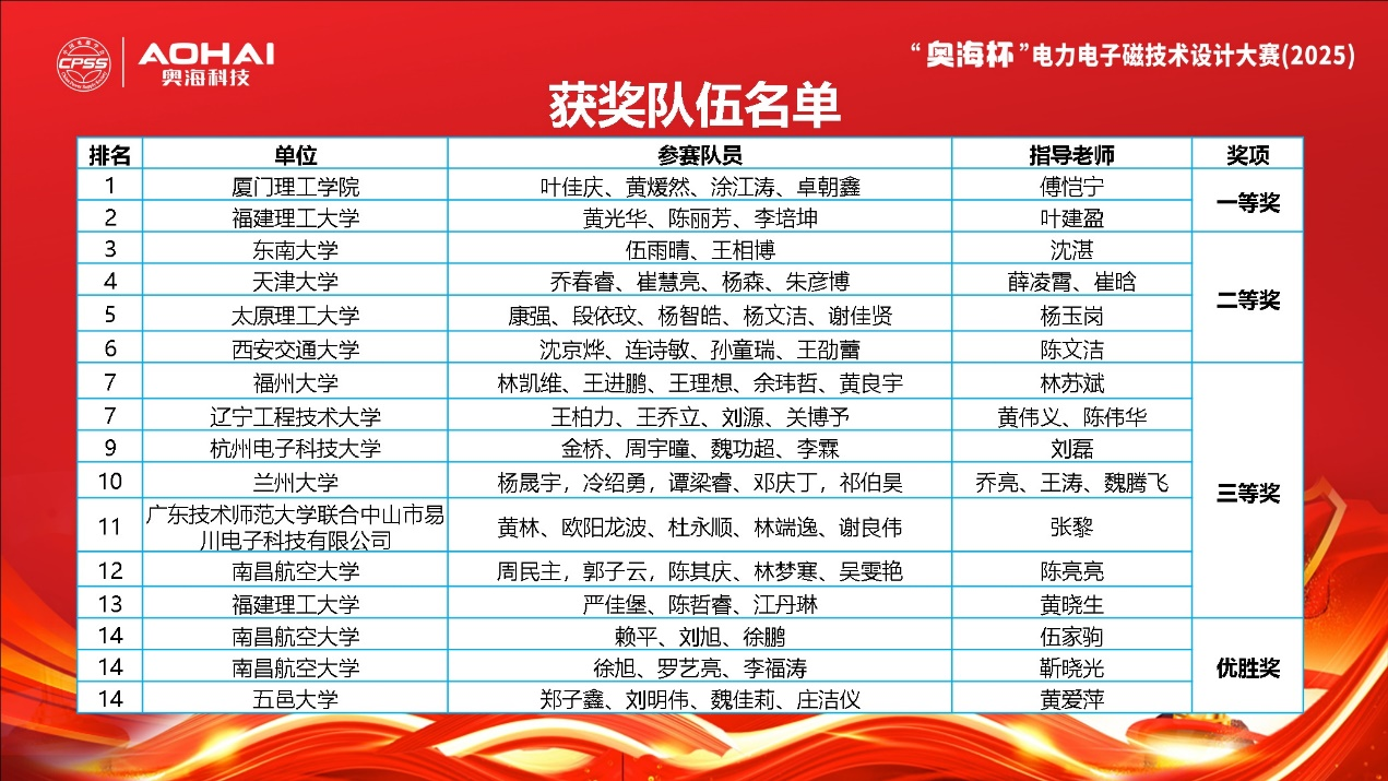 接下来,主办方代表中国电源学会磁技术专委会主任委员太原理工大学杨玉岗教授公布了本次决赛的获奖情况,经过激烈角逐,厦门理工学院、福建理工大学队伍斩获一等奖,东南大学、天津大学、太原理工大学、西安交通大学队伍获得二等奖,成人影视片