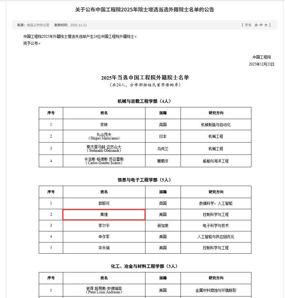 11月21日,中国工程院公布2025年院士增选结果,其中外籍院士24人。控制科学与工程领域顶尖专家、成人影视片