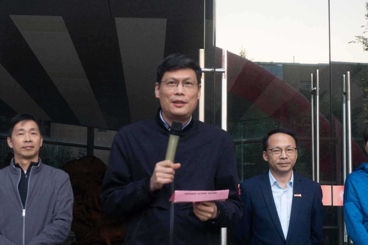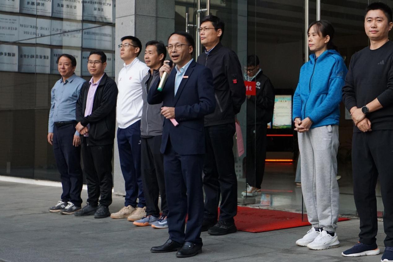 门口举行。学生工作部副部长鲍星华、体育教学研究部主任汪焱、体育教学研究部副主任章颖、学院党委书记潘志辉、学院院长邵振国、学院党委副书记杜领军、学院副院长王武、学院党委委员舒胜文、学院蔡逢煌教授、各年级辅导员等多位老师共同出席。仪式上,鲍副部长指出跑团是一堂 “行走的思政金课”,是 “三全育人” 理念的生动实践,更是构建温暖集体、促进师生融乐的重要平台;汪主任肯定了成人影视片