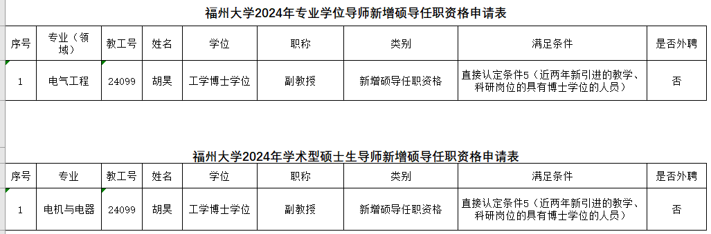 根据《关于做好2024年硕士研究生导师任职资格和招生资格认定工作的通知》(校研〔2023〕19号)和《关于印发《成人影视片 硕士研究生导师资格认定办法(试行)》的通知》(福大研〔2018〕56 号》等文件规定,经老师自行系统申报,学位点负责人审核,学院学术分委员会会议审核,确定胡昊老师通过2024年硕士研究生导师任职资格的认定,现予以公示。