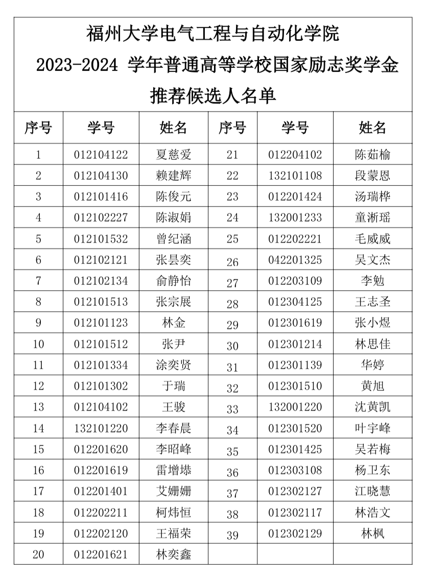 根据成人影视片 《关于做好 2023-2024 学年本科生国家励志奖学金》文件要求,经同学申请,学院资格审核,并经学院国家励志奖学金评审委员会评审。现学院国家励志奖学金评审委员会决定推荐李昭峰等 39 名同学参与成人影视片 2023-2024 学年“普通高等学校国家励志奖学金”评定。现将推荐候选人名单公示如下,公示时间为 2024 年 9 月 23日-2024 年 9 月 26 日,在此期间若对上述名单存有异议,请及时予以反馈。