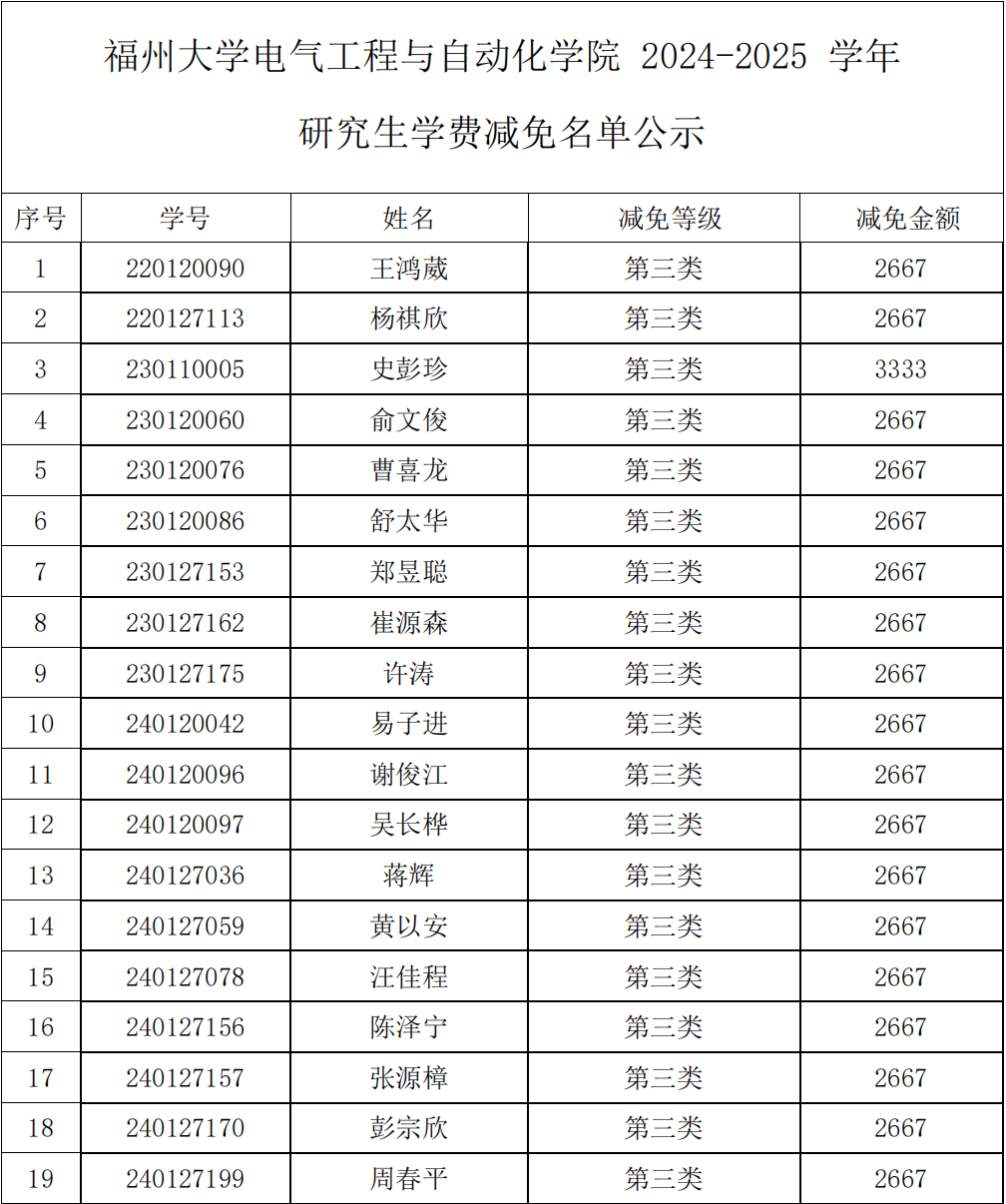 根据《关于做好2024-2025学年家庭经济困难研究生学费减免工作的通知》文件精神,经同学申请,学院资格审核,本着公平公正的原则,学院拟确定王鸿葳等19名同学为成人影视片 2024-2025学年学费减免候选人,具体名单见下表。现予以公示,公示时间为2024年12月5日-2024年12月7日,如有疑义,请在公示期内工作时间向成人影视片 学工组反映,电话:0591-22866584。