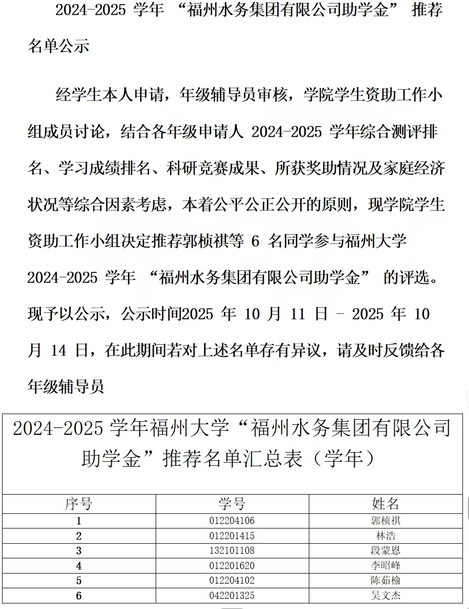 2024-2025 学年 “福州水务集团有限公司助学金” 推荐名单公示