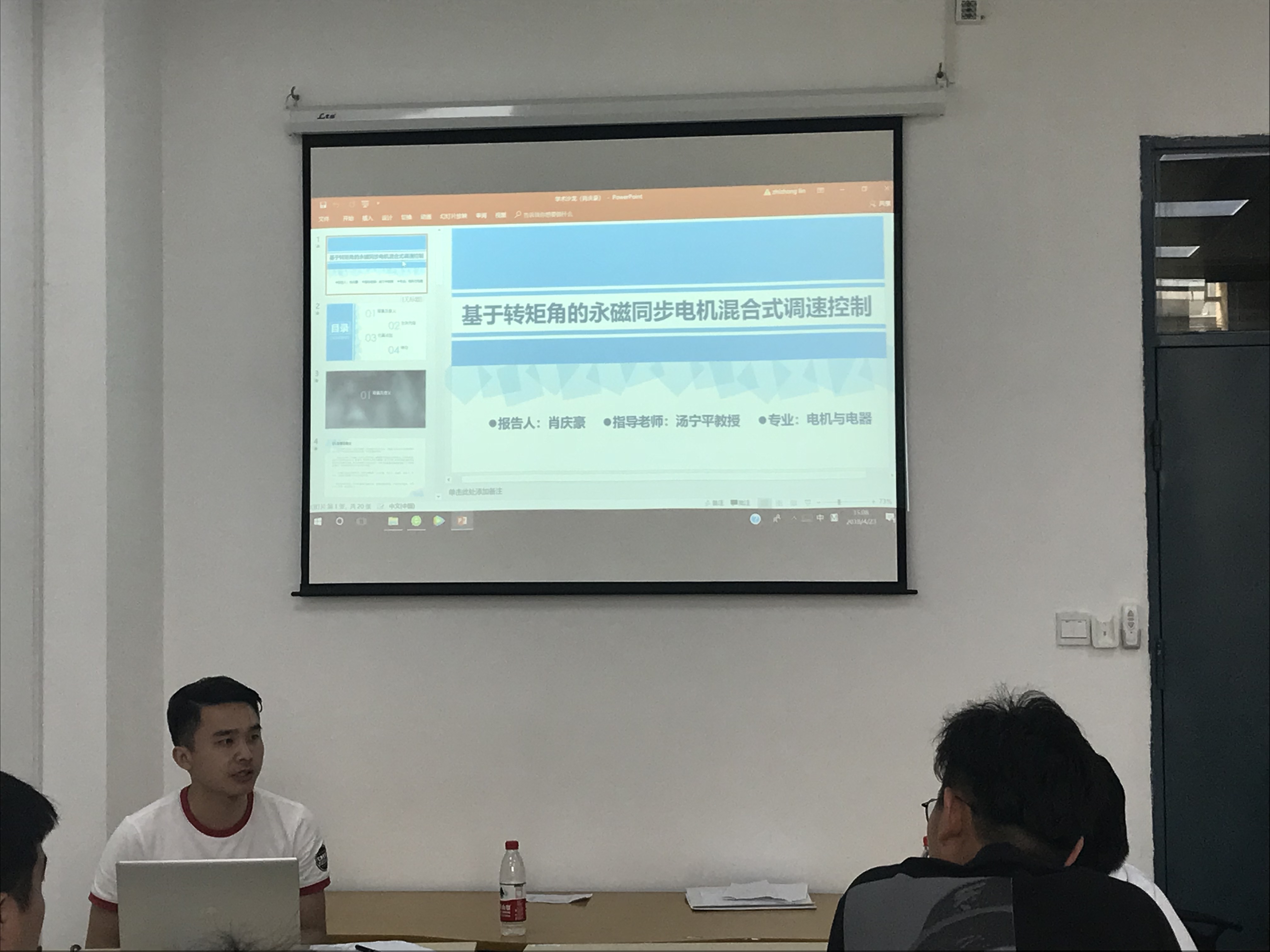 在主持人简单开场过后,报告会开始了。本次报告会报告内容为阮俊峰同学的《开关磁阻电机转矩脉动抑制研究》、肖庆豪同学的《基于转矩角的永磁同步电机混合式调速控制》、黄李威同学的《无刷直流电机转矩脉动抑制研究》以及黄凯同学的《基于电磁辐射的交直流电弧故障检测研究》。