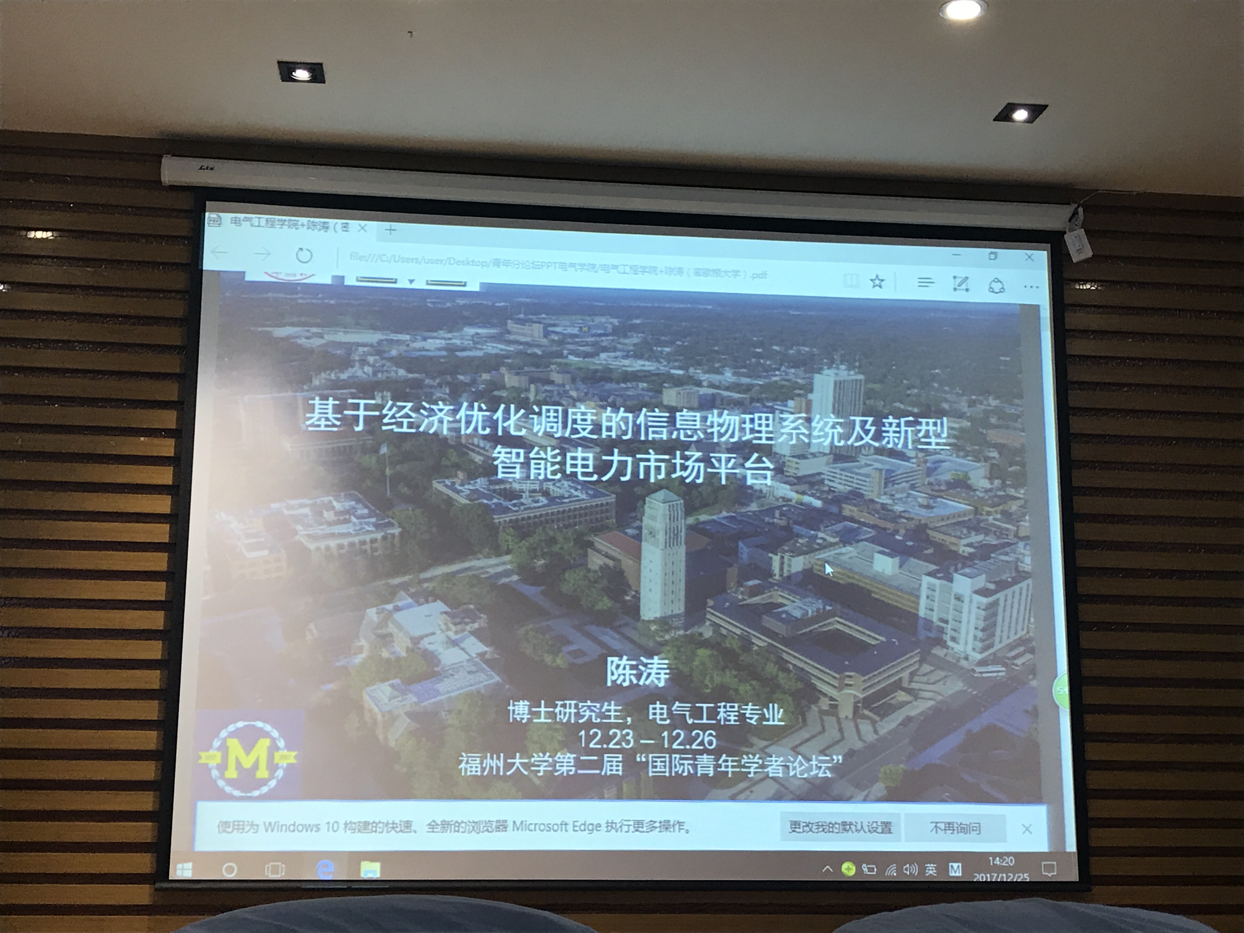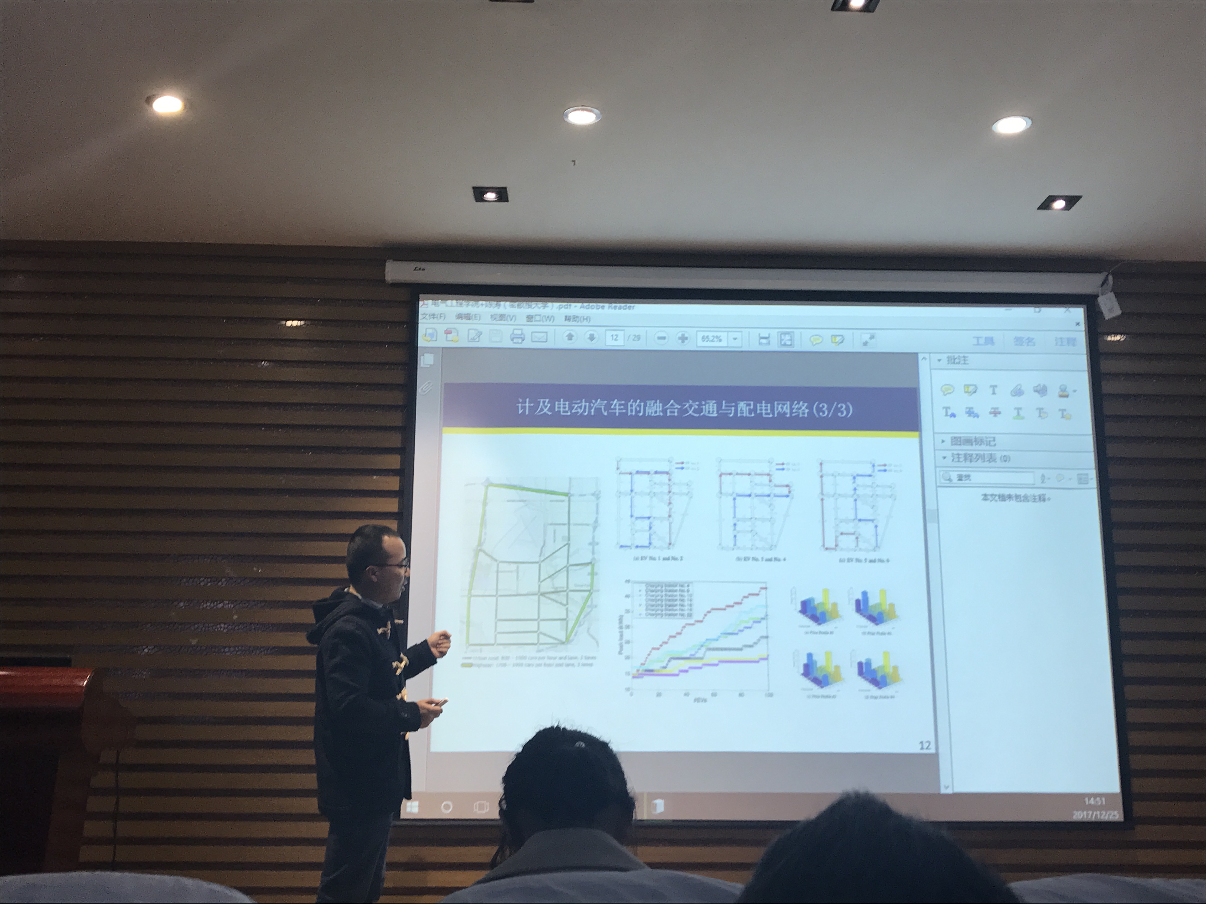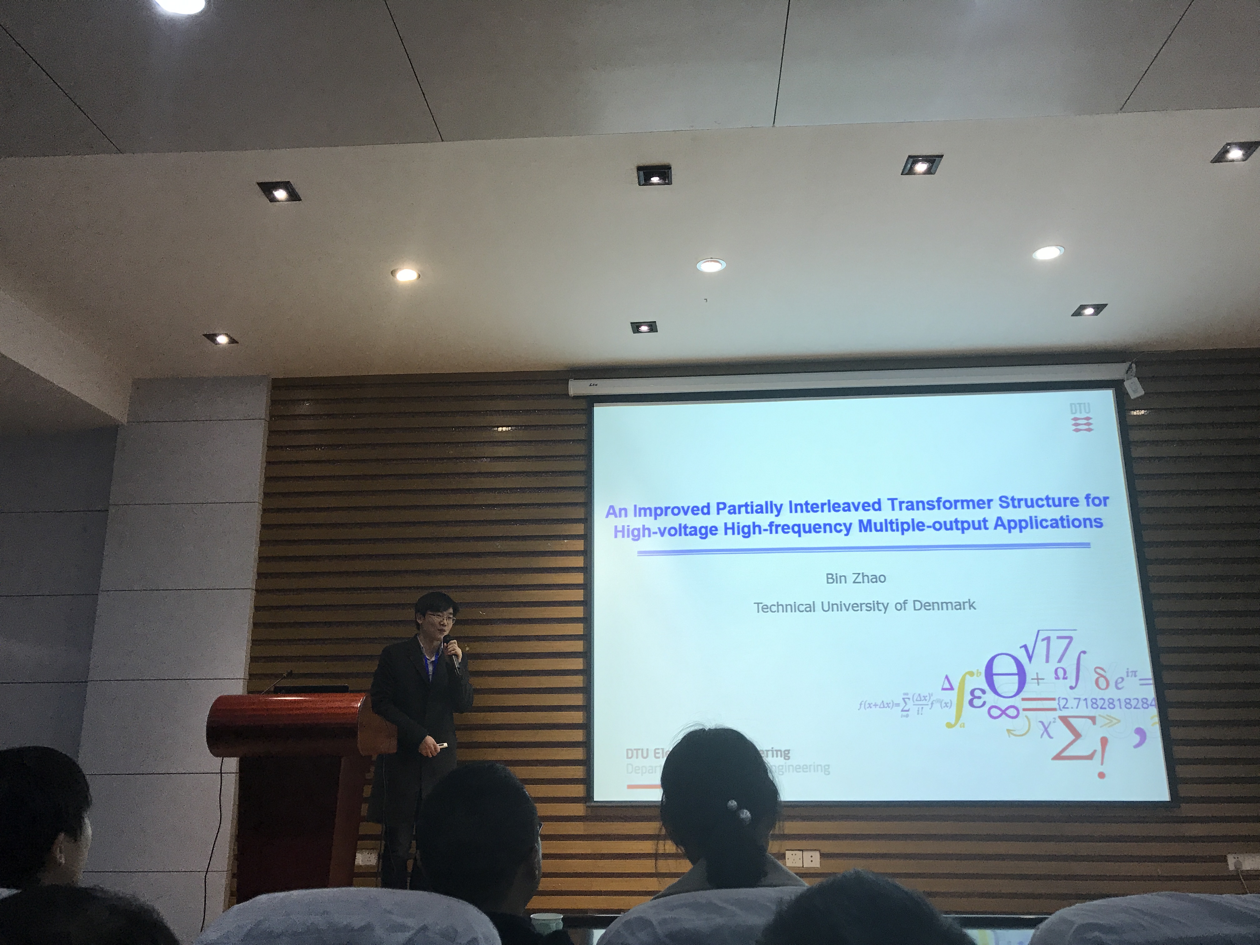首先许志红院长简短的介绍了下三位博士,随后陈涛博士上台为大家作报告,陈涛博士在美国密歇根大学攻读博士学位,攻读专业为电气工程,本次报告的题目是《基于经济优化调度的信息物理系统及新型智能电力市场平台》,陈博士主要从宏观的角度向我们阐述了关于经济原则的信息物理系统,在价格信号引导下介绍了多重复网络的应用、需求产能响应以及能源交易平台,如电动汽车充电行为、交通行为、电力网络负载行为以及市场价格分析,在电动汽车的融合交通与配电网络上分析该方案的使用前景;接下来作交流的是赵斌博士,赵斌于丹麦科技大学攻读博士学位,本次赵博士带来的题目为《An Improved Partially Interleaved Transformer Structure for High-voltage High-frequency Multiple-output Applications》,赵博士讲述了一种改进的高压高频输出的部分交错变压器结构应用,主要提出了单层部分交错结构,所提出的结构具有小的漏电感,小的AC / DC电阻和小的AC电容,适用于高电压高频率,该结构能实现效率达96.8%左右,同时频率可达500KHZ;最后是黄智聪博士,黄智聪博士是香港理工大学博士,本次带来的报告题目为《Basic Research in Wireless Inductive Power Transfer》,主要讲解了关于无线感应式电能传输的基础研究,黄博士首先介绍了香港理工大学的历史和校景,然后谈及到自己的研究方向-无线传输,无线传输技术运用的前景非常广泛,如人工器官的供电,无人机的控制,高电压的运输等,黄博士主要提出了一种用于EV电池充电的单级IPT转换器,以及讲述SSIPT配电系统的稳定性标准。
