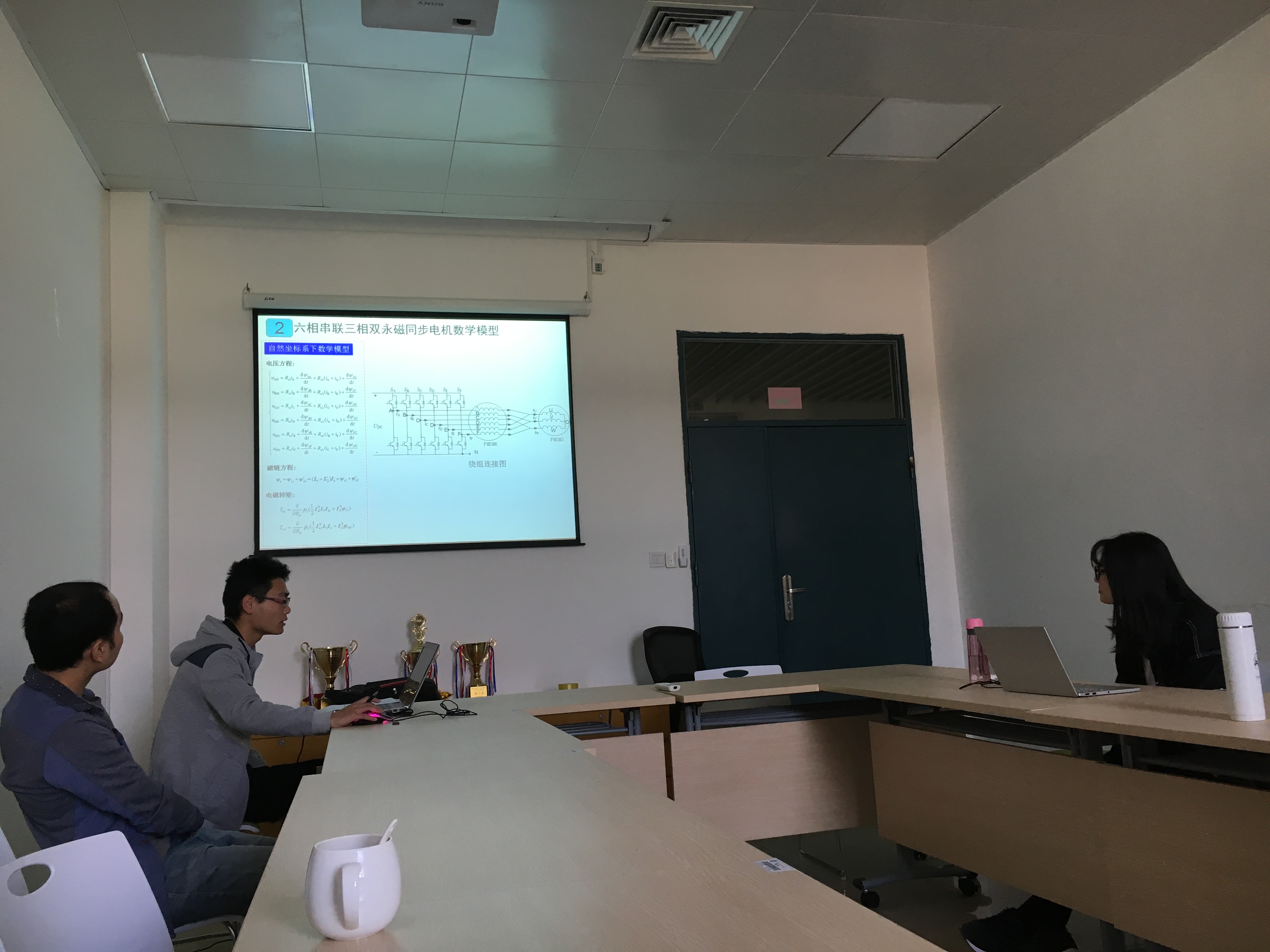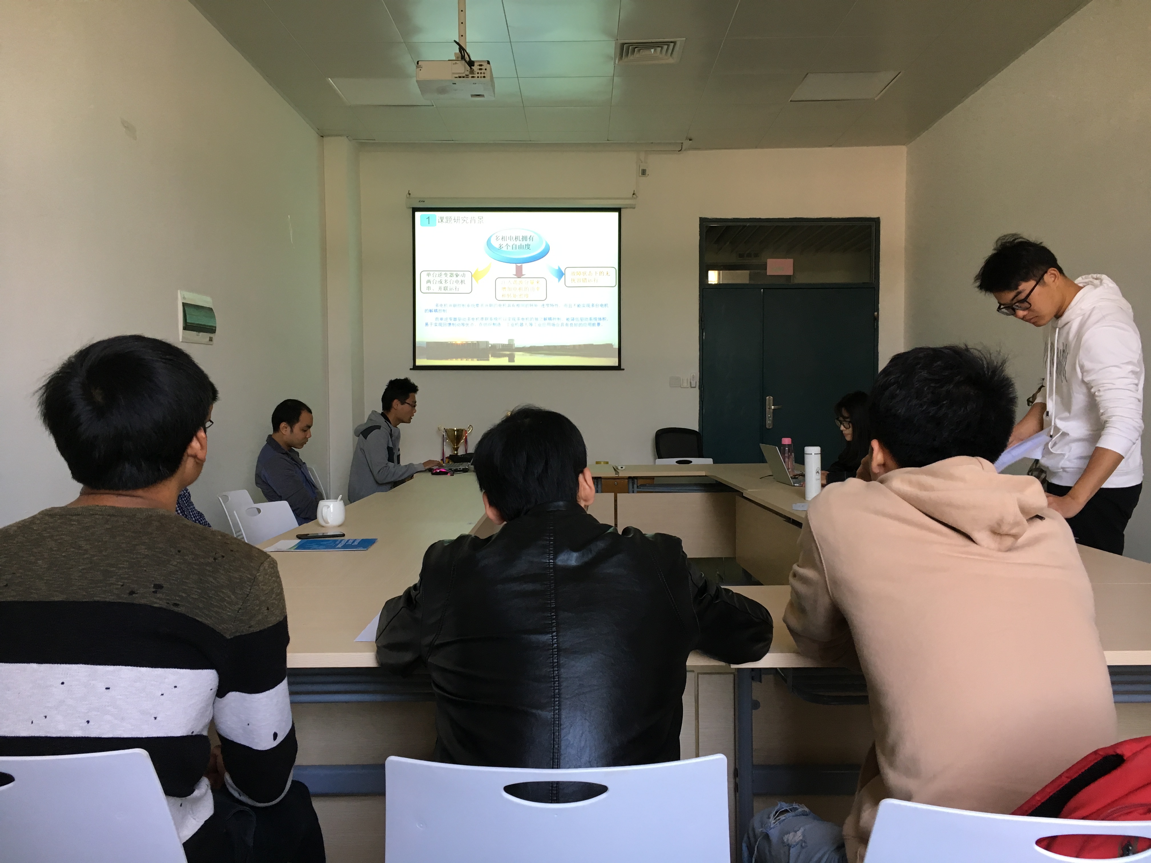主持人徐传豪简单开场过后,报告会就开始了。本次报告会的顺序依次是曾璐同学的《单级谐振型LED驱动电路》、邓锦晖同学的《基于宽禁带器件和矩阵式变压器的高频LLC谐振变换器的研究》、段庆涛同学的《单逆变器供电六相串联三相双永磁同步电机精确型直接转矩控制研究》、何幸同学的《有效值法测磁芯损耗的分析与验证》、李俊宏同学的《一种具有热管理特性的LED照明控制策略研究》、王凌波同学的《凸极式五相永磁同步电机预测型直接转矩控制》,以及郑梦飞同学的《单绕组无轴承磁通切换电机驱动控制研究》。