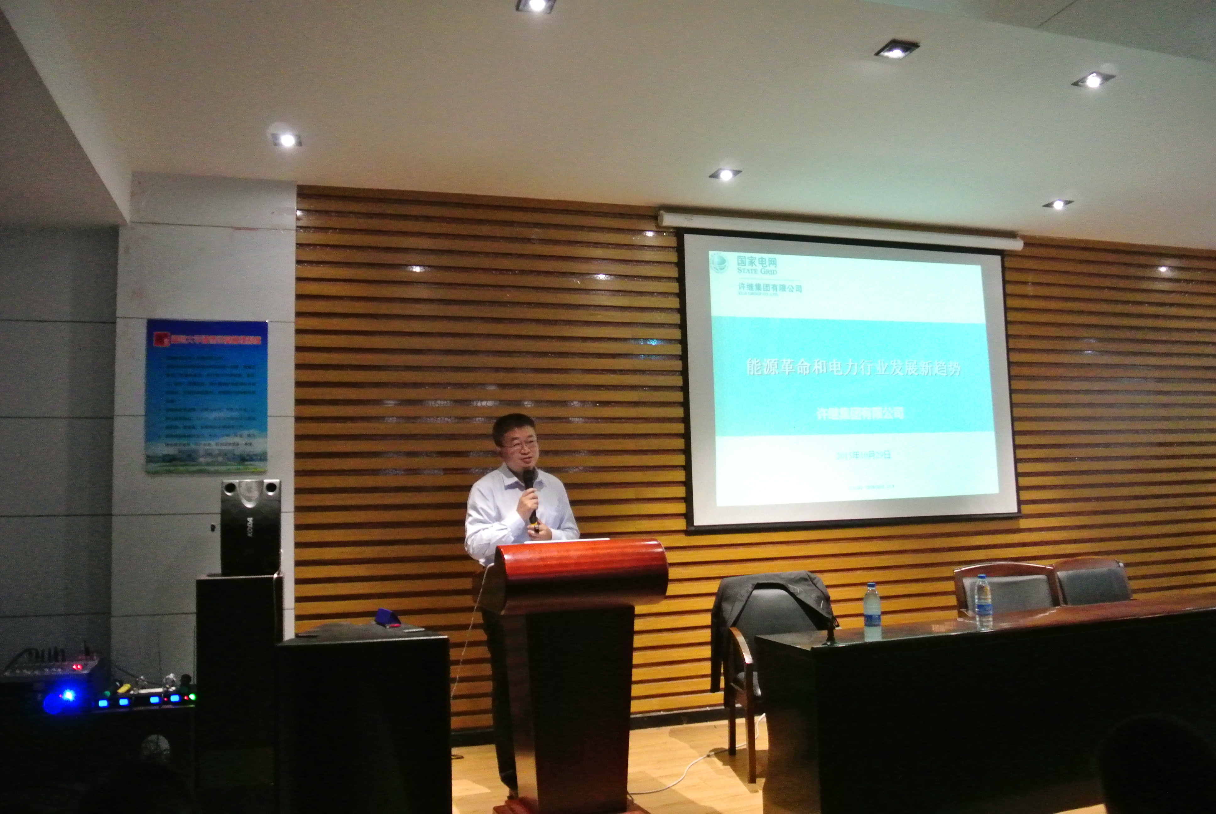 北230多功能报告厅里举行了一场关于能源革命与电力行业发展新趋势的学术交流活动。本次活动有幸邀请了主讲嘉宾张崇见博士,到场的有陈为院长、许继集团经理等。