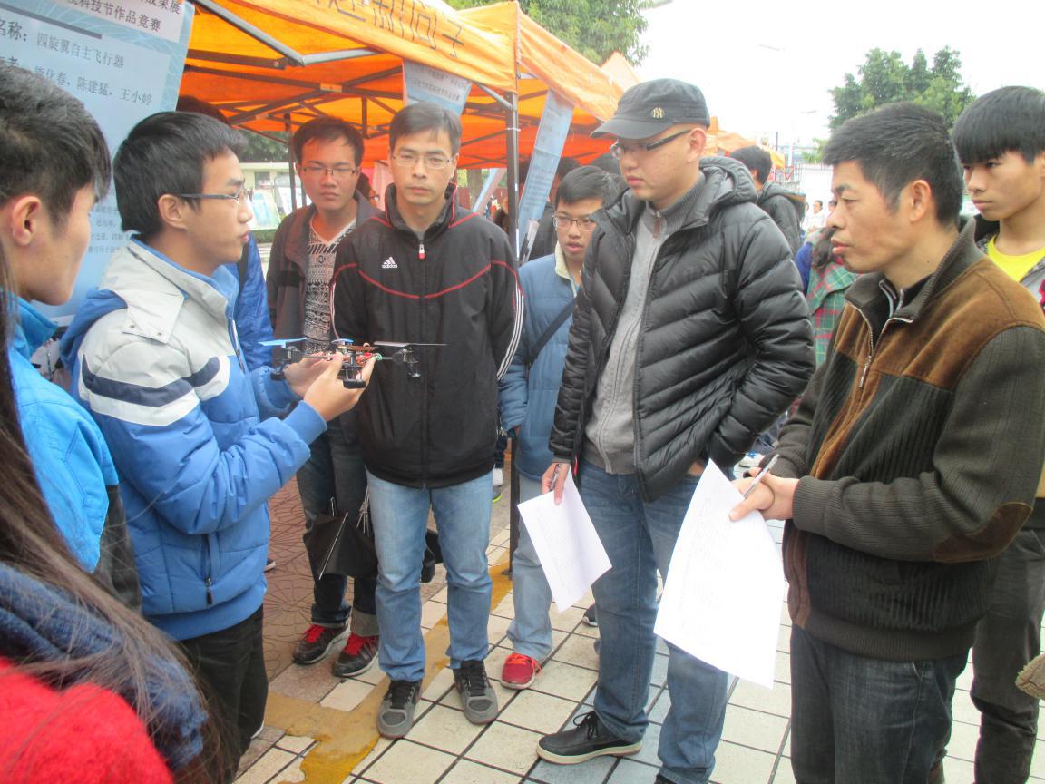 本次科技展同时展示了研究生与本科生的科研成果,并由评委老师对本科生的科研成果进行比赛评分。第一个参赛作品为平衡杆小车,采用电位器角位移传感器测量平衡杆角度和线性ccd感应赛道,结合传感器反馈的信息运用PD算法将控制信号传输给电机驱动,使小车保持摆杆垂直行走。第二个参赛作品双足机器人,采用STM32微控制器控制机器人进行双足直立行走,控制关键为机器人重心的把握,通过控制6个舵机的同时调节,实现重心地交替转移来完成机器人的各项动作。随后的参赛作品为四轴飞行器,通过陀螺仪、电子罗盘、超声波测距等模块采集数据并输出给控制板,采用PID算法对数据进行处理,算出相应电机的PWM增减量调节电机转速,使飞行器飞得更稳,实现从A区起飞,悬停,B区平稳降落。接下来是数字显示脉冲信号参数测试仪,本仪器可实现测量脉冲信号峰峰值、频率、有效值、占空比、上升沿和下降沿时间等参数。紧接的参赛作品为灭火机器人,通过光传感器检测周围障碍信息判断房间位置,依靠抗干扰复眼分辨墙壁反射光来检测房间火焰,通过PID算法调节电机转动,移动至房间蜡烛位置,并喷射出水雾将火焰熄灭。随后还有简易旋转倒立摆及控制装置、智能舞蹈机器人和循迹直立智能小车等参赛作品的展示。在本科科研成果展示后,念平、百毅、王建明和张清波等研究生们为我们展示了各自的科研成果。