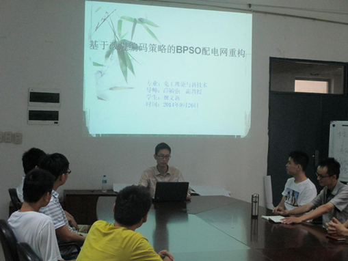 首先上场的是蔡博南同学,他讲述了《基于ARMA双谱分析与HMM模型的断路器故障诊断研究》,介绍了应用此方法对断路器振动信号故障识别有较高的准确性,为断路器故障诊断提供一个新的思路,对于保证电力系统的安全与可靠运行都具有重要意义。接着,陈端航同学就《直驱风电系统及电机控制的研究》这一主题,阐述了如何将风这种典型的可再生能源转换成电能馈入电网的。紧接着魏文新同学介绍《基于改进编码策略的BPSO配电网重构》,提出改进编码策略的BPSO算法,避免产生大量的不可行解,使得寻优效率大大提高。然后叶斌同学论述《基于Android系统的KOA运动监测系统研究》,通过对信号的采集与处理设计了一种便捷式的膝骨性关节炎运动监测系统,KOA患者可以通过该监测系统了解自身运动规范性并作出适当的调整。再然后陈嘉鹏同学介绍《应用电路分析法评估油纸绝缘变压器绝缘状态》,思路清晰,逻辑合理,结构严谨,数据可靠。随后陈静洁同学的《基于WSN和露点控制的开关柜防潮系统研制》阐明如何预防凝露积水,同时建立WSN,实现与上位机软件的信 息交互。最后张伟骏同学展示他的《一种变电站端子箱防潮控温系统的设计》是如何做到防止端子箱凝露的。