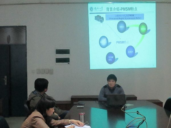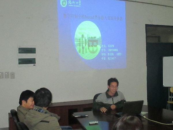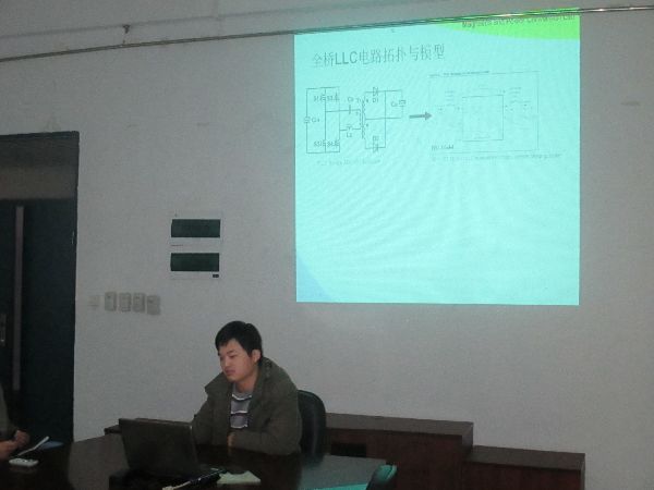 首先做报告的是李超同学,他介绍了《集磁式OCT磁场与温度场耦合分析》研究背景与内容,讲解深入浅出,将理论知识结合图片,详尽细致地娓娓道来。接下来由黄晓生讲述《高功率密度平面变压器设计与损耗评估》,思路清晰,突出重点。紧接着刘金海、郑庆杰、邱琰辉分别对自己所研究的《Matlab自带永磁同步电机模型矢量坐标变换分析与国产化改造》、《电流侦测技术》、《数字控制全桥boost型多输入直流变换器》进行介绍。在于同学和老师的积极提问跟热烈讨论中,此次报告会也渐近尾声。