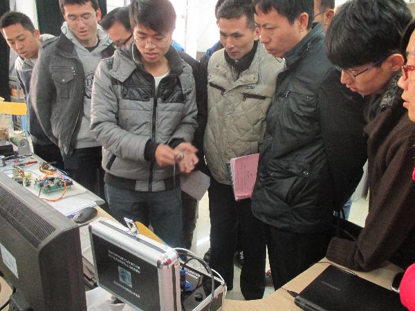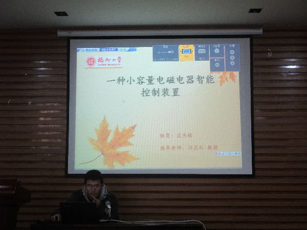 首先做报告的是朱宇翔同学,带来他们组《基于Zigbee技术的电力电缆绝缘在线监测系统研究》的实物报告,该实物是基于环流法理论实现电缆绝缘的在线检测,通过检测护套上的环流值的大小来判断电缆是否老化。层层深入的讲解让在座同学都受益良多。接下来由卢国仪,黄重庆,骆明峰,郑新桃,罗海海,吴守龙,孙秦阳,庄杰榕,郭才萌等九位同学分别对各自组做的实物《基于Zig-bee技术的智能漏电保护终端设计制作》,《建筑检测自动数据采集无线传输系统》,《开关柜电弧故障检测》,《配电开关状态检测系统》,《交流接触器的数字化智能控制器》,《智能交流接触器》,《智能交流接触器控制器》,《一种小容量电磁电器智能控制装置》与《基于IAP的移动机器人研究》进行了介绍。各位代表都对自己的实物作品的基本原理,思路,创新点都做了详细的说明,给大家带来了生动又不失专业的介绍。各位听众同学也是反响激烈,积极对代表进行提问,代表耐心详细的解答各种疑问,与同学们积极探讨作品不足需改进之处,赢得了同学们的热烈掌声。最后老师也对他们的作品做出了专业中肯的点评,鼓励他们取得更大的进步。报告会结束后,在同学们的陪同下,老师们一起前往南106,现场对实物进行了调试和评比,并和同学们耐心交流成果心得。这场实物评比报告会,在学院各专业取得不错的反响和评价。