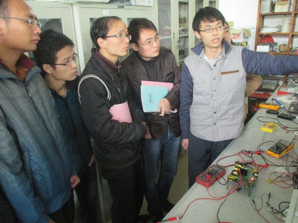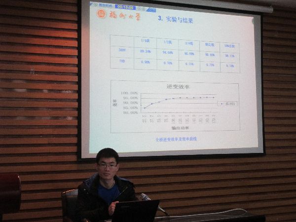 首先上场的是第一组的代表林健鹏同学,所作的报告为《150W车载逆变器的研制》在报告中向大家展示了他所设计的额定输入直流24V,输出交流220V的纯正弦波逆变器,额定功率150W。同时,为蓄电池设计一个市电输入、输出90W的充电器,用于蓄电池的充电管理。接下来,林燕云、王小彬、蔡锦森、何勇吉、卢文成、钟晓龙、洪春辉、曾智强及黄朝兴这9位参赛小组代表,也分别带来各自组精心设计的实物报告《基于dsPIC33f不同控制下逆变输出电压特性分析》、《宽输入高效微功率光伏并网逆变器研究》、《基于L6562A功率因数校正电路的设计》、《单周期控制PFC变换器研制》、《磁共振无线电能传输系统研究》、《非接触电能传输应用制作》、《数控LLC多路LED均流调光驱动电源》、《高频功率电感器关键参数自动测量装置》和《智能管家——不倒翁》。代表们在详细地介绍完自己所设计的实物原理及创新的基础上,还现场向各位观众展示了自己的实物,令大家赞叹不已。