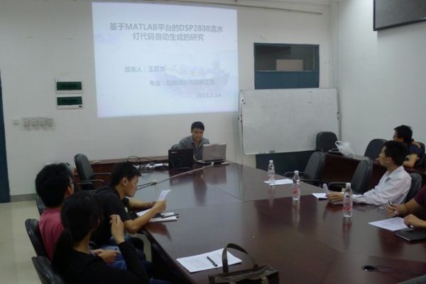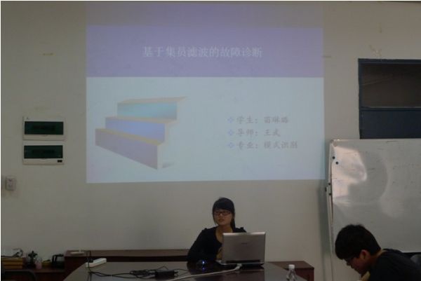 首先,王跃龙同学介绍了基于MATLAB平台的DSP2808流水灯代码自动生成的研究,并给我们展示了硬件的实现;接着,石敦义同学对低压断路器振动信号的特征量提取这一研究课题进行了详细说明;然后张圣超同学讲解了基于无线传感网实时监护系统的设计与实现,这一课题提出了自动化技术在生活中的实际应用;紧接着,由祁冰露同学提出了一种小波技术的应用----基于过完备稀疏表示得图像滤波;最后,巾帼不让须眉的苗琳璐同学细心地解说了基于集员滤波器的故障诊断。