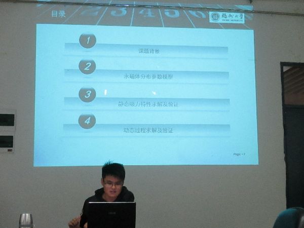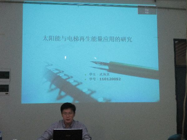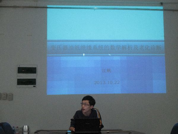 首先上场的是武海龙同学,他声情并茂地讲解太阳能与电梯再生能量应用的研究;接下来是董钊同学针对并网型太阳能光伏发电系统研究,提出了新颖的拓扑结构;紧接着是吴金龙同学的永磁接触器中永磁体磁路模型的研究,基于磁场分析,提出了永磁体的分块等效磁路模型;之后是陈颖昭同学对“心电检测及分析系统设计”的报告,思路清晰,重点突出;随后的江帆同学通过对大量的实验数据的统计和分析,叙述变压器油纸绝缘系统的数学解析及老化诊断;洪汇隆同学紧密结合生活案例,形象具体介绍膝骨性关节炎运动质量评估系统设计;李进波同学图文并茂对静电振膜式电压互感器研究的过程及其工作原理进行了详尽的介绍;最后出场的蒋东东同学介绍“谐波污染用户建模”的方法及参数计算,简洁明了地阐述了他对谐波污染的理解。活动中老师对每个同学的报告进行了点评,提出其研究内容存在的问题以及对如何去完善学术报告提出了宝贵的意见。