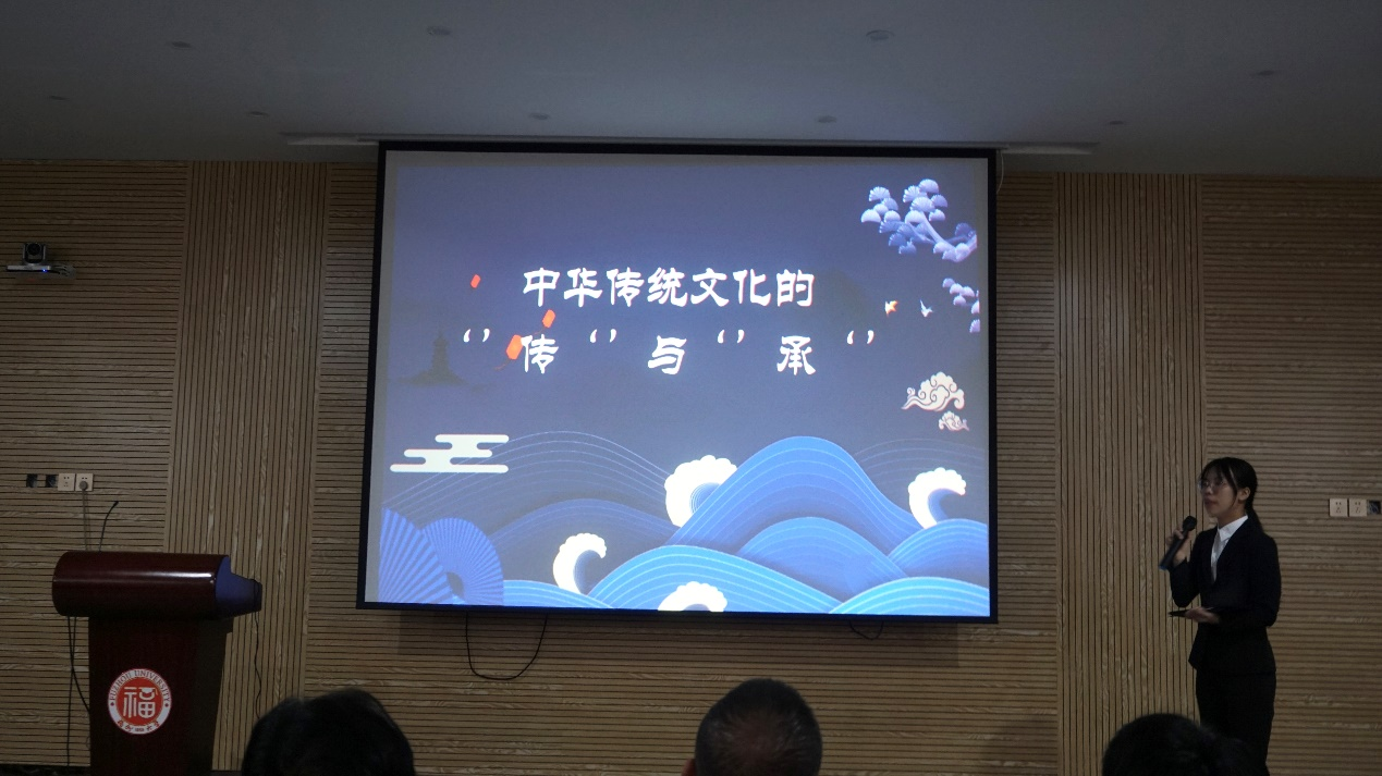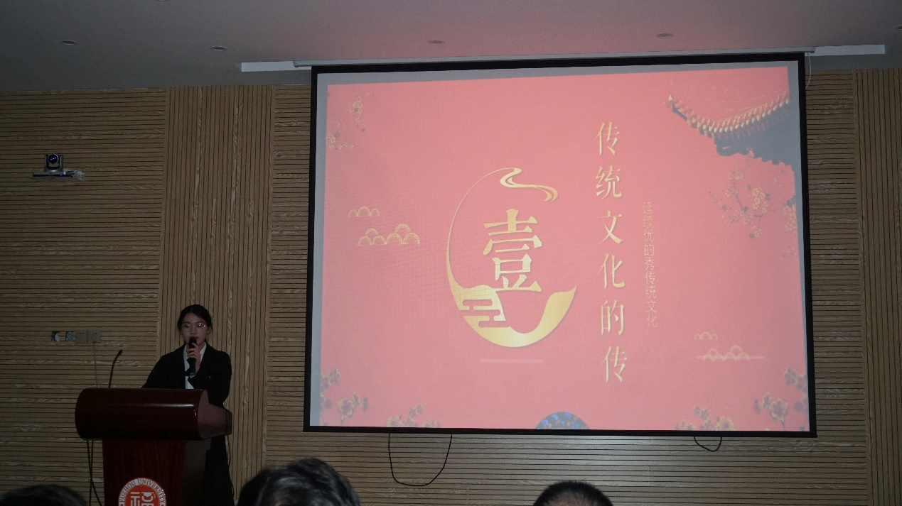 决赛在主持人简短的介绍后拉开了帷幕。各支队伍以饱满的精气神围绕着“诚信”和“传承”进行了多方面的讲演。如“桃园三义”队以樊锦诗守护莫高窟敦煌作为传统文化的切入点,伴着古风的背景音乐,为我们娓娓道来了传统文化的传承到创新;“干啥啥不行”队的开头小动画让人眼前一亮,随后以深蓝色的传统背景,开门见山的说了传统文化是什么、为什么要传承传统文化以及该怎么做去传承;“诚信模范”队的队名就直截了当点名主题,而以白色为底,整体风格十分简洁干练同时引经据典,图片和文字结合恰到好处,随着绘声绘色的讲述让我们了解到了诚信的重要性;“我们都是仙女”队从一段记忆开头,以图文并茂的形式结合有形和无形的文化,再到抗疫中文化的作用;再如“每天一只猫”队主要讲述了国粹京剧,排版布局夺人眼球,展现出了古代传统的中华文化特色。