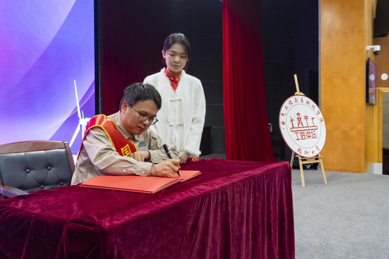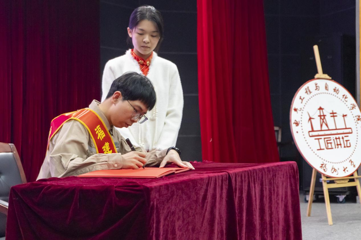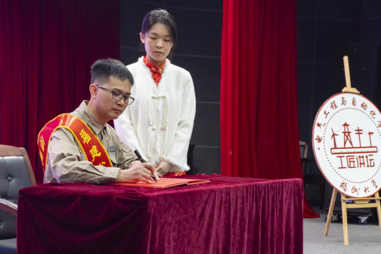 讲座结束后,邵振国副院长为蒋祖立、张坤三、王榆工程师颁发嘉宾证书,学生代表为三位嘉宾献花,三位嘉宾也为“工匠讲坛”题字。
