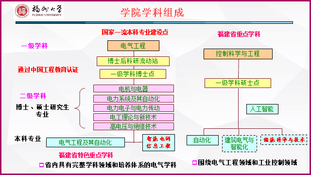 电气工程学科是国家一流本科专业建设点、福建省省级特色重点学科,2018年通过了中国工程教育认证,其中电器专业博士点是全国最早一批建立的电器专业博士点,也是成人影视片 最早建立的两个博士学位授权点之一。控制科学与工程学科是福建省重点学科。目前,学院拥有电气工程一级学科博士点和博士后科研流动站、控制科学与工程一级学科硕士点、新能源发电与电能变换福建省重点实验室、福建省电器智能化工程技术研究中心、工业自动化控制技术与信息处理福建省高校实验室、福建省电器行业技术开发基地、福建省医疗器械行业技术开发基地、清真食品产业科技创新公共服务平台、福建省研究生培养创新基地和福建省专业学位研究生联合培养示范基地等。电气工程学科在福建省内建立最早,在省内具有最完整学科科研方向与人才培养体系,在国家“双一流”建设中,电气工程学科列入福建省一流学科(高原学科)建设计划。